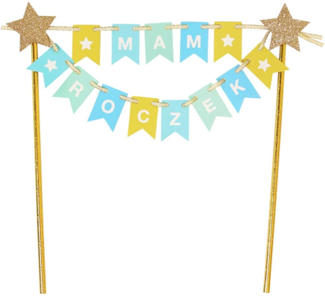 Topper na tort, "Mam roczek, dla chłopca", niebieski, 1 szt. Piękny topper na tort z napisem "Mam Roczek" w kolorze niebieskie widocznym na zdjęciu wykonany w postaci baneru z flag. Dodaje niesamowitego efektu podczas celebracji urodzin w gronie znajomych lub rodziny. Nadaje się do wielokrotnego użytku pod warunkiem nie uszkodzenia go podczas imprezy. Topper na tort to mały, dekoracyjny element, który jest umieszczany na wierzchu tortu. Może być wykonany z różnych materiałów, takich jak papier, plastik lub drewno, i może mieć różne kształty i wzory. Topper na tort jest często używany do ozdabiania tortów urodzinowych, ślubnych i innych okazji specjalnych. Ma na celu dodanie dodatkowej dekoracji i uczynienie tortu bardziej atrakcyjnym wizualnie. Ulepszenie wyglądu: Topper na tort może znacznie ulepszyć wygląd tortu i nadać mu bardziej elegancki i atrakcyjny wygląd. Personalizacja: Topper na tort może być personalizowany zgodnie z preferencjami i okolicznościami, co pozwala na stworzenie unikalnego i wyjątkowego tortu. Łatwość użycia: Topper na tort jest łatwy w użyciu i można go łatwo przyciąć i dopasować do rozmiaru tortu.