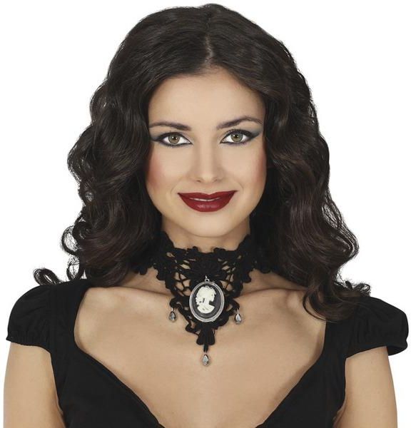 Choker ozdobny Elegancki, haftowany naszyjnik w stylu retro. Wykonany z czarnego materiału o koronkowym splocie, ozdobiony dekoracyjnym medalionem w kolorze srebrnym z wizerunkiem kobiecego profilu oraz zwisającymi kryształkami. Dodaje tajemniczego i zmysłowego charakteru każdej stylizacji. Cechy produktu Styl: retro, gotycki Kolor: czarny z elementami srebrnymi Ozdobny medalion i wiszące kryształki Haftowana struktura Mocowanie na szyi Idealny na bal przebierańców, halloween, imprezę w stylu gotyckim lub karnawał. Sprawdź także inne akcesoria retro Koronkowe rękawiczki Kolczyki z czarnymi kamieniami Stylowe wachlarze i torebki Wzbogać swój kostium i stwórz niepowtarzalny klimat!
