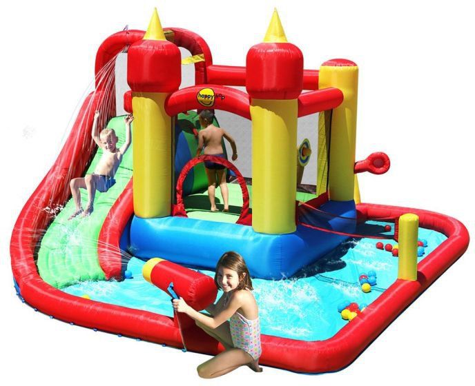 PRODUKT NIE JEST PRZEZNACZONY DO UŻYTKU KOMERCYJNEGO Dmuchany Zamek wodny dla dzieci zapewni ulgę i maksimum zabawy w upalne dni! Dmuchany plac zabaw posiada dodatkową opcję – możesz napełnić basenik wodą, a także, podłączając dmuchańca do bieżącej wody – aktywować wodne wyposażenie dla jeszcze większej zabawy! W chłodniejsze dni Twoje dzieci mogą wykorzystywać plac zabaw bez konieczności uzupełniania wodą. Dmuchaniec: Dmuchany WODNY ZAMEK dmuchana trampolina HappyHop ze zjeżdżalnią podstawa 385x410 cm zabawka idealna dla 5 osób zjeżdżalnia pole i siatka do gry w siatkówkę armatka wodna pole do rzutów miejsce na uzupełnienie wodą Duży dmuchany zamek wodny z trampoliną i zjeżdżalnią Podobno w dzisiejszych czasach trudno jest odciągnąć najmłodsze dzieci od smartfonów i ekranów komputera… Zupełnie nie zgadzamy się z tym stwierdzeniem. Maluchy uwielbiają najróżniejsze zabawy na świeżym powietrzu, trzeba tylko zapewnić im odpowiednie do nich warunki! Wystarczy tylko spojrzeć na oferowany przez nas duży, dmuchany zamek wodny z trampoliną i zjeżdżalnią, by przekonać się, co mamy na myśli. Dmuchany zamek wodny HappyHop to rozbudowana zabawka o wymiarach podstawy 385 na 410 centymetrów, co oznacza, że jednocześnie może z niej korzystać nawet pięcioro dzieci. A jest gdzie się bawić! Dmuchany zamek wodny HappyHop posiada nie tylko efektowną zjeżdżalnię i trampolinę o bardzo dobrym skoku, ale także pole do rzutów i armatkę wodną. Co więcej, grube i wystarczające ścianki sprawiają, że zamek może służyć także jako mały basen! To zdecydowanie fantastyczna propozycja dla maluchów, które upalne, letnie dni uwielbiają spędzać w towarzystwie rodzeństwa i przyjaciół na świeżym powietrzu. Dmuchany zamek wodny HappyHop – bezpieczna zabawa to udana zabawa! W naszym sklepie internetowym 4IQ Group wychodzimy z założenie, że tylko w stu procentach bezpieczna zabawa może być udana, dlatego dbamy o to, by wszystkie oferowane przez nas zabawki spełniały niezbędne normy bezpieczeństwa. Proponowany duży dmuchany zamek wodny z trampoliną i zjeżdżalnią jest testowany zgodnie z europejską normą bezpieczeństwa zabawek EN71, a ponadto spełnia wymagania amerykańskiej normy ASTM. Co więcej, zabawka jest zgodna także z wieloma innymi światowymi standardami, między innymi EMC czy SAA. Dmuchany zamek wodny HappyHop jest wykonany z wytrzymałego PVC oraz podwójnie laminowanego i podwójnie obszywanego nylonu. Trampolina jest natomiast ogrodzona wysokiej jakości siatką, uniemożliwiającą maluchom wypadnięcie z platformy. Jak widzisz, duży dmuchany zamek wodny z trampoliną i zjeżdżalnią to fantastyczny model, który będzie znakomitym dodatkiem do urodzinowej zabawy lub relaksowania w ogrodzie . Dmuchaniec - Dmuchany ZAMEK WODNY - zabawa! Świetna atrakcja na każdej plenerowej imprezie :) Dzieci uwielbiają ruch oraz zabawę na świeżym powietrzu. Niesamowitej frajdy dostarczają im więc wszelkiego rodzaju atrakcje ogrodowe. Największym marzeniem wielu maluchów jest własny, dmuchany zamek. Ten model to nie tylko wspaniały zamek dmuchany do skakania, ale równocześnie zjeżdżalnia z basenem. Dzięki temu zapewni maluchom dwa razy więcej ruchu oraz rozrywki i szybko się nie znudzi. Dmuchańce marki HappyHop posiadają wiele zalet – są łatwe w transporcie i montażu, a przede wszystkim dostarczają znakomitej zabawy! Twoje dzieci mają tysiąc pomysłów na minutę? Oto propozycja w sam raz dla nich! Bez trudu można rozłożyć go samodzielnie, a samo nadmuchiwanie trwa około 60 sekund. Duża powierzchnia sprawia, że z atrakcji może korzystać kilkoro dzieci naraz. W zestawie dmuchawa dużej mocy! Dzięki zintegrowanemu systemowi wielokomorowemu dmuchańce HappyHop oferują doskonały efekt skoku. Oznacza to, że nawet jeśli kilkoro dzieci skacze razem, efekt odbicia utrzymuje się, ponieważ powietrze znajduje się w kilku komorach. Powietrze delikatnie ulatuje poprzez szwy, natomiast dmuchawa nieustannie wtłacza powietrze do wnętrza dmuchanego zamku. Dmuchaniec ZAMEK WODNY - Trwałość! Zamek wykonany jest z trwałego PVC oraz podwójnie laminowanego, podwójnie obszywanego nylonu, Pozostaje nadmuchany dzięki ciągłemu przepływowi powietrza, który zapewnia dołączona dmuchawa. Ścianki boczne wykonane z mocnej siatki - rodzice w każdej chwili mogą kontrolować zabawę Dmuchańce marki Happy Hop posiadają wiele zalet – są łatwe w transporcie i montażu, a przede wszystkim dostarczają znakomitej zabawy! Twoje dzieci mają tysiąc pomysłów na minutę? Oto propozycja w sam raz dla nich! Bez trudu można rozłożyć go samodzielnie, a samo nadmuchiwanie trwa około 60 sekund. Duża powierzchnia sprawia, że z atrakcji może korzystać kilkoro dzieci naraz. W zestawie dmuchawa dużej mocy! Dmuchaniec WODNY ZAMEK - Bezpieczeństwo! Zamek dmuchany jest testowany zgodnie z normą EN71 (europejska norma bezpieczeństwa zabawek), a także z jeszcze bardziej surowymi normami amerykańskimi ASTM. Dmuchawa jest testowana przez TÜV i GS. Ponadto spełnionych jest wiele innych światowych standardów: EMC / BS / SAA / 16CFR1500.3 / 16CFR1505 / UL. AC 220 - 240 Volt W3E, 400-450 Watt IPX 4 (Odporne na wodę) 50 Hz certyfikowane przez TÜV/GS (TÜV Rheinland) Wymiary dmuchańca szerokość: 385 cm głębokość: 410 cm wysokość: 220 cm Przechowywanie: zalecamy, aby dmuchane place zabaw przechowywać w temperaturze 5-40 stopni Celsjusza. W zestawie otrzymują Państwo dmuchaniec Zamek Wodny - zamek dmuchany 4 szpile do mocowania dmuchańca mocną dmuchawę 4 szpilki do zamocowania dmuchawy zestaw naprawczy torbę do przenoszenia Maksymalne obciążenie całkowite: 135 kg Maksymalna waga użytkownika: 45 kg numer przedmiotu: 9016