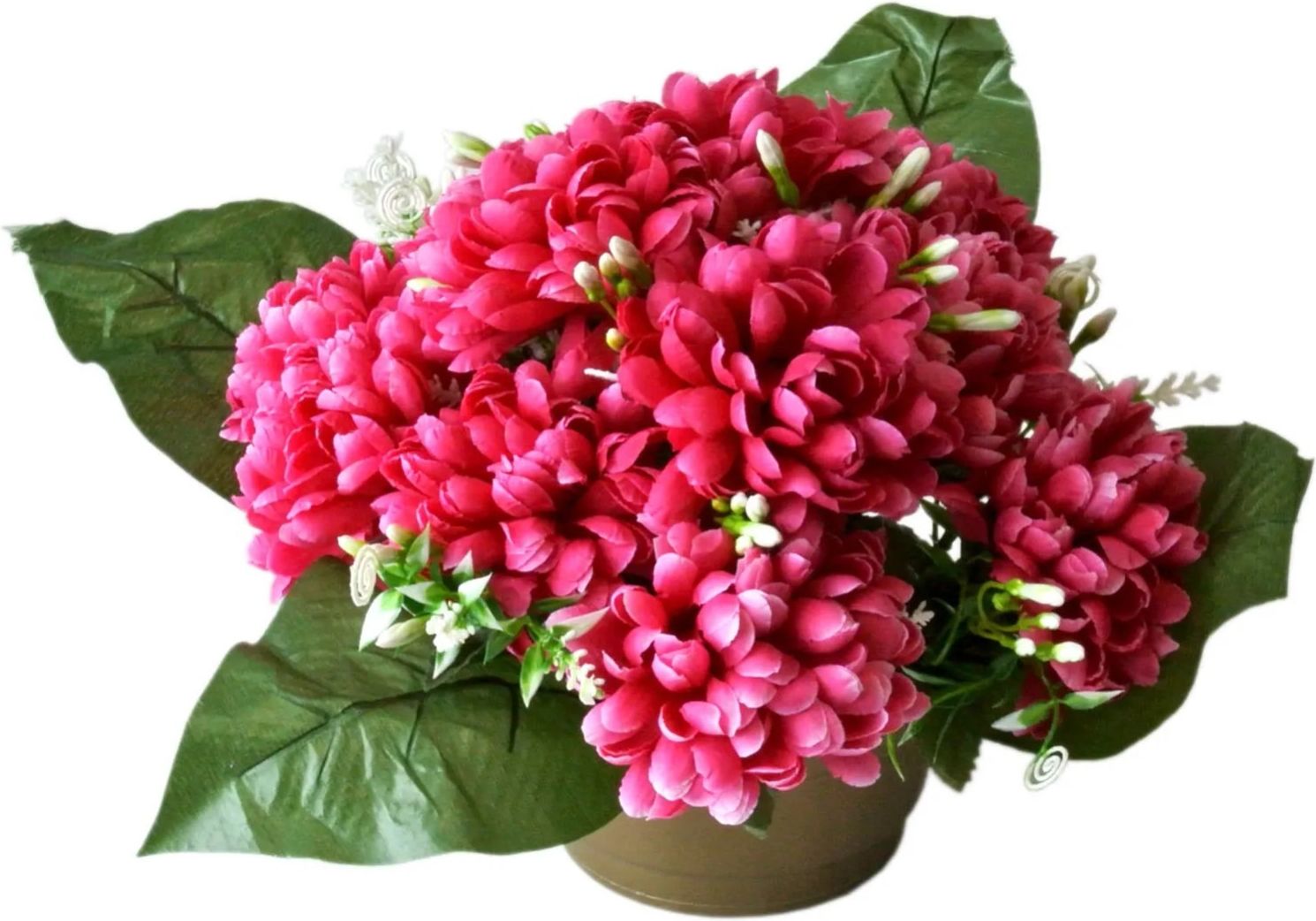 Kompozycja 10 kwiatów w donicy Bukiet 10 kwiatów chryzantemy + przybranie z liści Sztuczne kwiaty wyglądają jak żywe - będą piękną dekoracją wewnętrzną, jak i zewnętrzną. Kwiaty wykonano z wysokiej jakości tworzywa sztucznego, dzięki czemu nie wymagają podlewania, są odporne na warunki zewnętrzne i zachowują świeży wygląd przez bardzo długi czas.