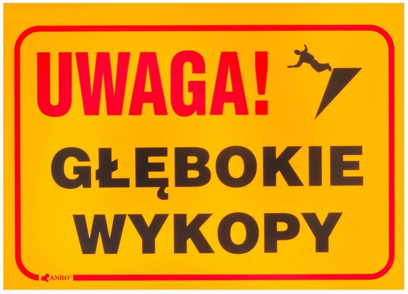 Znak "GŁĘBOKIE WYKOPY" firmy Brik. Jest to wykonany z wysokiej jakości materiału znak informacyjny, który przyda się wszędzie tam, gdzie zachodzi potrzeba udzielenia istotnych informacji w celu zapewnienia bezpieczeństwa.Znak charakteryzuje się trwałym i czytelnym nadrukiem, dzięki czemu jest doskonale widoczny i odporny na szkodliwe działanie czynników atmosferycznych.