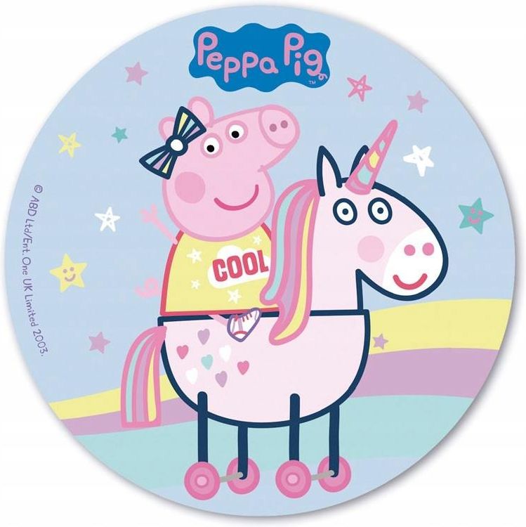 ŚWINKA PEPPA Jadalny OPŁATEK NA TORT 20 cm Opłatki wyprodukowano z użyciem jadalnych atramentów bezsmakowych. Pod wpływem wilgoci na cieście opłatek ładnie dopasowuje się do podłoża i z łatwością się kroi. Opłatki układane na masie cukrowej należy delikatnie zwilżyć wodą lub posmarować jadalnym …