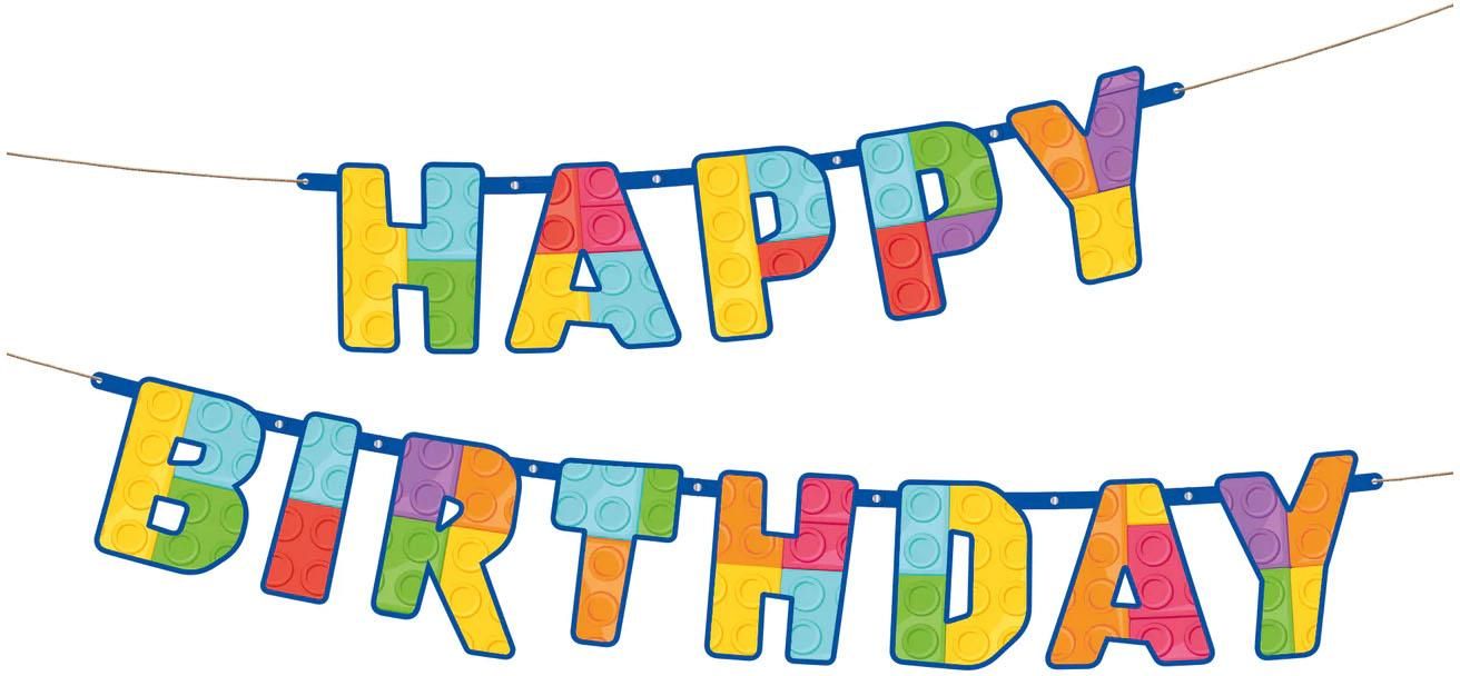 Baner z napisem Happy Birthday z zestawu Klocki, idealny na urodziny. Wymiary: 180 x 16 cm. Opakowanie: 1 szt.
