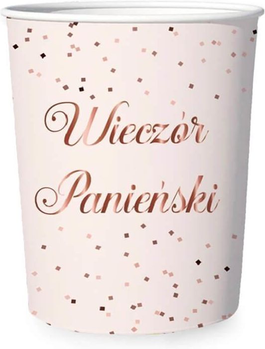 Papierowe kubeczki w kolorze różowym z różowo złotym nadrukiem Wieczór Panieński. Wysokość: 9 cm. Opakowanie: 6 szt.