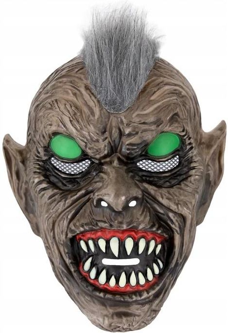Maska Goblin z fluorescencyjnymi oczami Maska goblina z zielonymi fluorescencyjnymi oczami święcącymi w ciemnościach oraz szpiczastymi zębiskami to kolejna propozycja strasznego przebrania na Halloween i bale kostiumowe. Zaskakujący elementem jest pęczek sterczących włosów które, w zaskakujący sposób, łagodzą wizerunek potwora.