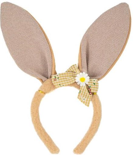 Opaska z uszami zajączka i kokardką w kolorze beżowym. Idealny dodatek na Wielkanoc. Szerokość: 14 cm. Wysokość całkowita: 32 cm. Opakowanie: 1 szt.