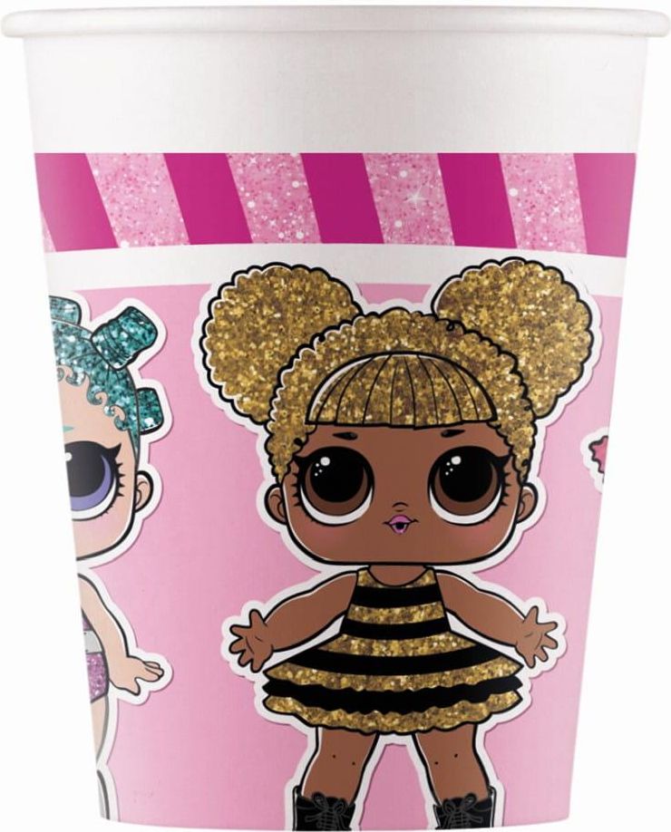 Kubeczki papierowe LOL Glitterati. Opakowanie zawiera 8 szt. kubeczków z barwnym wzorem - postaciami bohaterów bajki LoL. Doskonałe rozwiązanie na przyjęcie urodzinowe, czy imprezę dla dzieci w domu, lokalu lub w przedszkolu. Kubeczki są atestowane - dopuszczone do kontaktu z żywnością. Pojemność kubeczka około 200 mililitrów. Nadają się zarówno do napojów zimnych jak i ciepłych (ale nie gorących). Produkt na licencji.