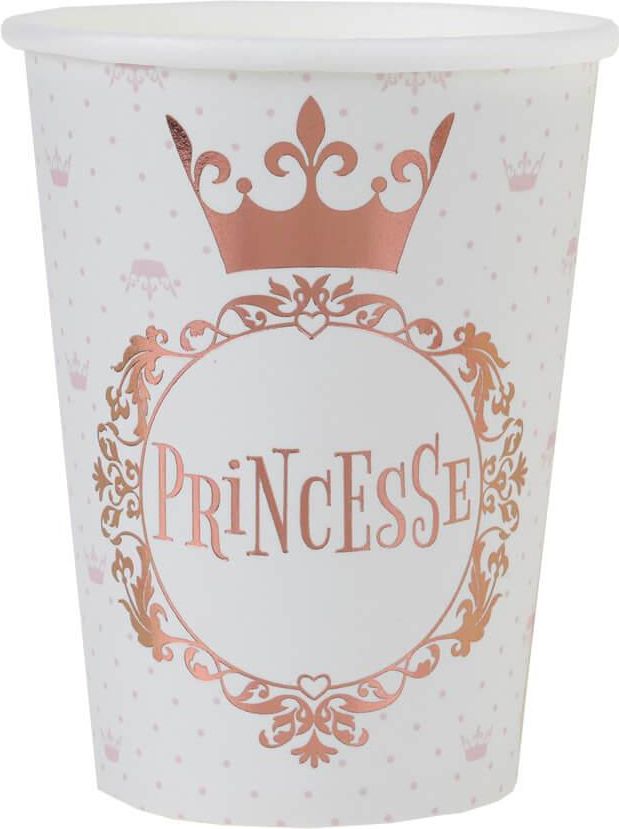 Papierowe kubeczki urodzinowe w kolorze białym z różowo złotym metalizowanym napisem "Princesse" oraz ornamentem i koroną. Idealne na urodziny dla małej księżniczki. Wymiary: śr. 7,8 cm x 9,7 cm. Pojemność: 270 ml. Opakowanie: 10 szt.