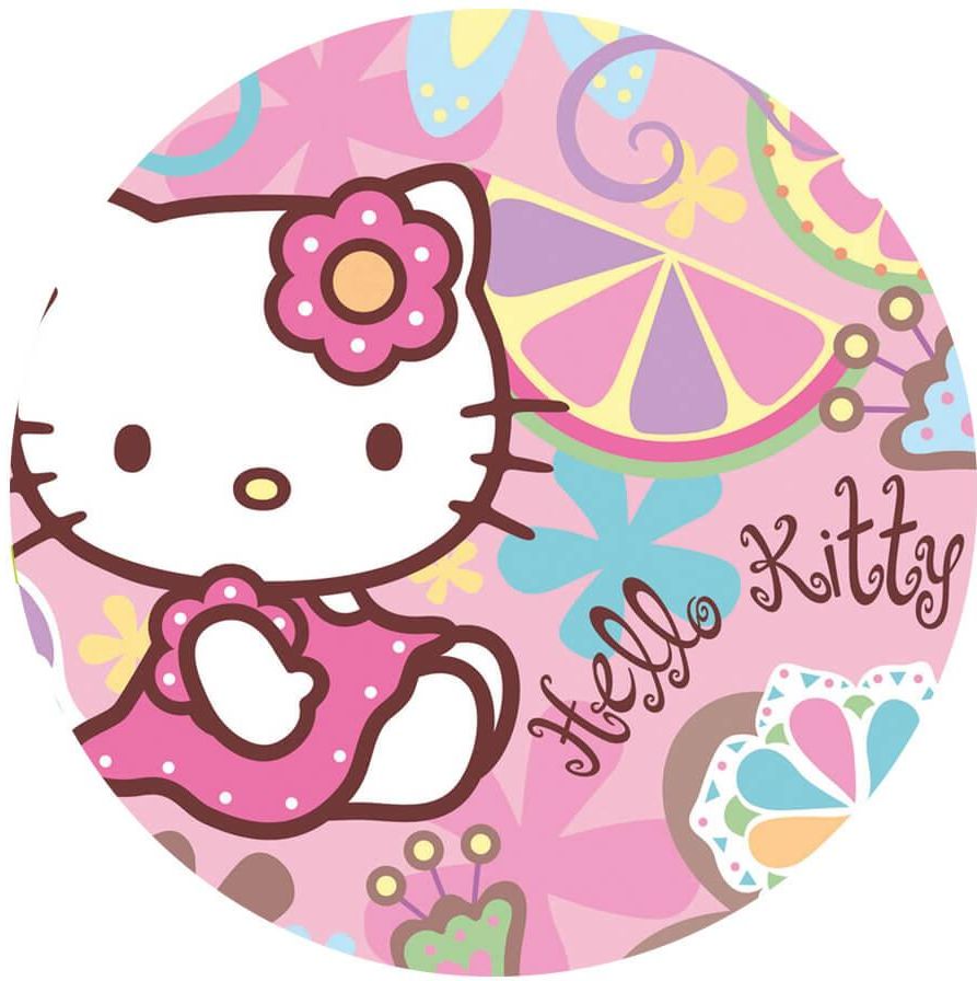 Dekoracyjny opłatek tortowy okrągły Hello Kitty. Średnica: 20 cm. Opakowanie: 1 szt. Wzór opłatka zlecony przez klienta do wydruku, stanowi on charakter podglądowy.