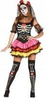 STRÓJ LOS MUERTOS L Zestaw zawiera: sukienkę, welon, rękawki. Krótka sukienka do połowy uda, na grubszych ramiączkach. Góra sukienki czarna, z nadrukowanymi żebrami i kolorowymi kwiatami. Dół sukienki złożony z trzech warstw: różowej czerwonej i żółtej, zakończonych czarnymi falbankami z tiulu. Rękawki koronkowe z czerwonymi ściągaczami. Welon koronkowy na opasce, zdobiony kwiatami. Na pozostałych naszych aukcjach oferujemy: szeroki wybór dekoracji w stylu Los Muertos, a także maski czy farbki do charakteryzacji strój szkielet kwiaty kolorowa Los Muertos