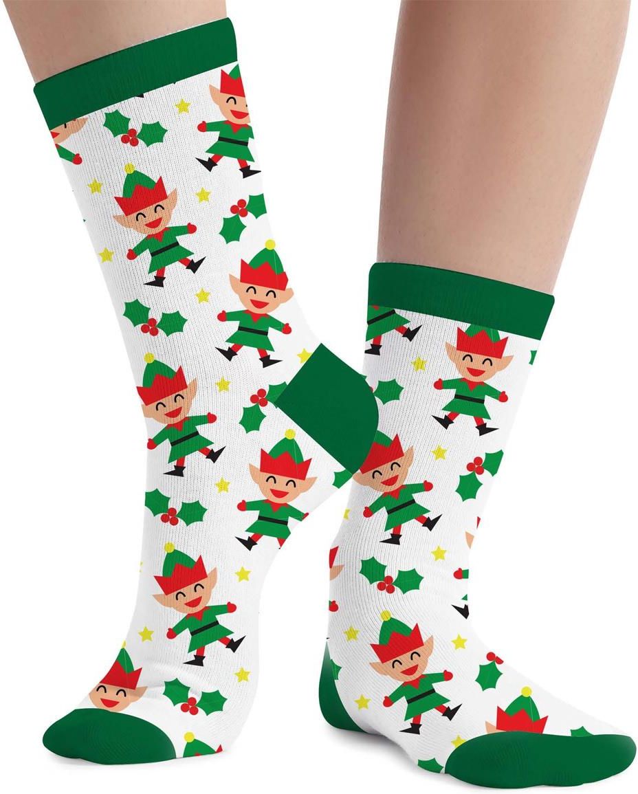 Skarpety świąteczne z nadrukiem elfów, idealne na święta Bożego Narodzenia. Rozmiar: 22-28. Wykonane z poliestru.