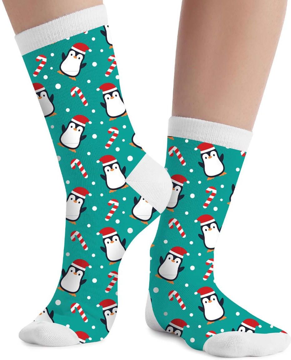 Skarpety świąteczne z nadrukiem pingwinków i lasek cukrowych, idealne na święta Bożego Narodzenia. Rozmiar: 28-35. Wykonane z poliestru.