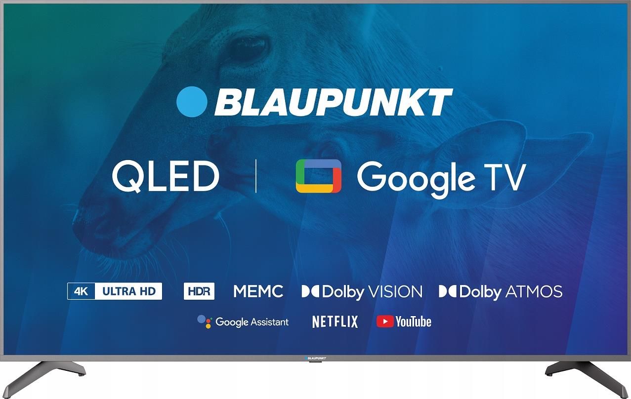 Telewizor QLED Blaupunkt 85QBG8000 85 cali 4K UHD Telewizor QLED Blaupunkt 85QBG8000 85 cali 4K UHD to idealny wybór dla osób poszukujących niesamowitej jakości obrazu i dźwięku. Dzięki zaawansowanej technologii QLED oraz rozdzielczości 4K UHD, ten ogromny ekran o przekątnej 85 cali zapewni wrażenia wizualne na najwyższym poziomie. System Google TV dostarcza nieograniczony świat treści multimedialnych, umożliwiając dostęp do popularnych aplikacji jak Netflix, YouTube czy Amazon Prime Video. Niezrównana jakość obrazu Telewizor Blaupunkt oferuje rozdzielczość 3840x2160, co czyni obraz niezwykle szczegółowym i realistycznym. Technologia QLED zapewnia ponad miliard żywych kolorów, które są jaśniejsze i bardziej wyraźne dzięki wsparciu dla trybu HDR. Częstotliwość odświeżania 60 Hz gwarantuje płynność obrazu, co jest kluczowe podczas oglądania dynamicznych scen w filmach czy grach. Imponujący dźwięk Telewizor Blaupunkt jest wyposażony w zaawansowane technologie dźwiękowe, takie jak Dolby Digital oraz Dolby Atmos, które tworzą wciągające środowisko dźwiękowe 3D. Dzięki temu oglądanie filmów i słuchanie muzyki staje się zupełnie nowym doświadczeniem. Wbudowane głośniki o mocy 20 W dostarczają czysty i pełny dźwięk, który doskonale współgra z wysoką jakością obrazu. Wszechstronne funkcje Smart TV Telewizor Blaupunkt z systemem Google TV zmienia sposób oglądania telewizji. Łączy wszystkie usługi streamingowe w jednym miejscu, umożliwiając przeglądanie i oglądanie ulubionych programów i filmów na jeszcze wyższym poziomie. Dodatkowe funkcje telewizora obejmują: wbudowany Chromecast, obsługa Google Assistant, dostęp do aplikacji takich jak Google Play Store, Netflix i YouTube, możliwość podłączenia do sieci Wi-Fi oraz Bluetooth, kompatybilność z uchwytami VESA. Porty i złącza Dzięki licznym portom i złączom telewizor Blaupunkt jest niezwykle wszechstronny: 4 złącza HDMI, 2 porty USB, wejście DVB-T/T2, DVB-C ATV oraz DVB-S2. Szczegóły techniczne i wymiary Telewizor Blaupunkt oferuje bardzo dużą przekątną ekranu - 85 cali, co czyni go doskonałym wyborem do dużych salonów czy przestrzeni multimedialnych. Wymiary urządzenia bez podstawy to szerokość 189,9 cm x wysokość 108,7 cm x głębokość 8 cm. Z podstawą wymiary wynoszą szerokość 189,9 cm x wysokość 117,1 cm x głębokość 45 cm. Telewizor waży 39,1 kg bez podstawy oraz 55,8 kg brutto. Podsumowanie Telewizor QLED Blaupunkt 85QBG8000 to doskonały wybór dla osób oczekujących najwyższej jakości obrazu i dźwięku. Dzięki zaawansowanej technologii QLED, rozdzielczości 4K UHD, wsparciu dla Dolby Atmos, oraz wszechstronnym funkcjom smart TV z systemem Google TV, ten telewizor spełni oczekiwania nawet najbardziej wymagających użytkowników. Liczne porty HDMI i USB oraz kompatybilność z uchwytami VESA zapewniają łatwość podłączania dodatkowych urządzeń i montażu na ścianie.