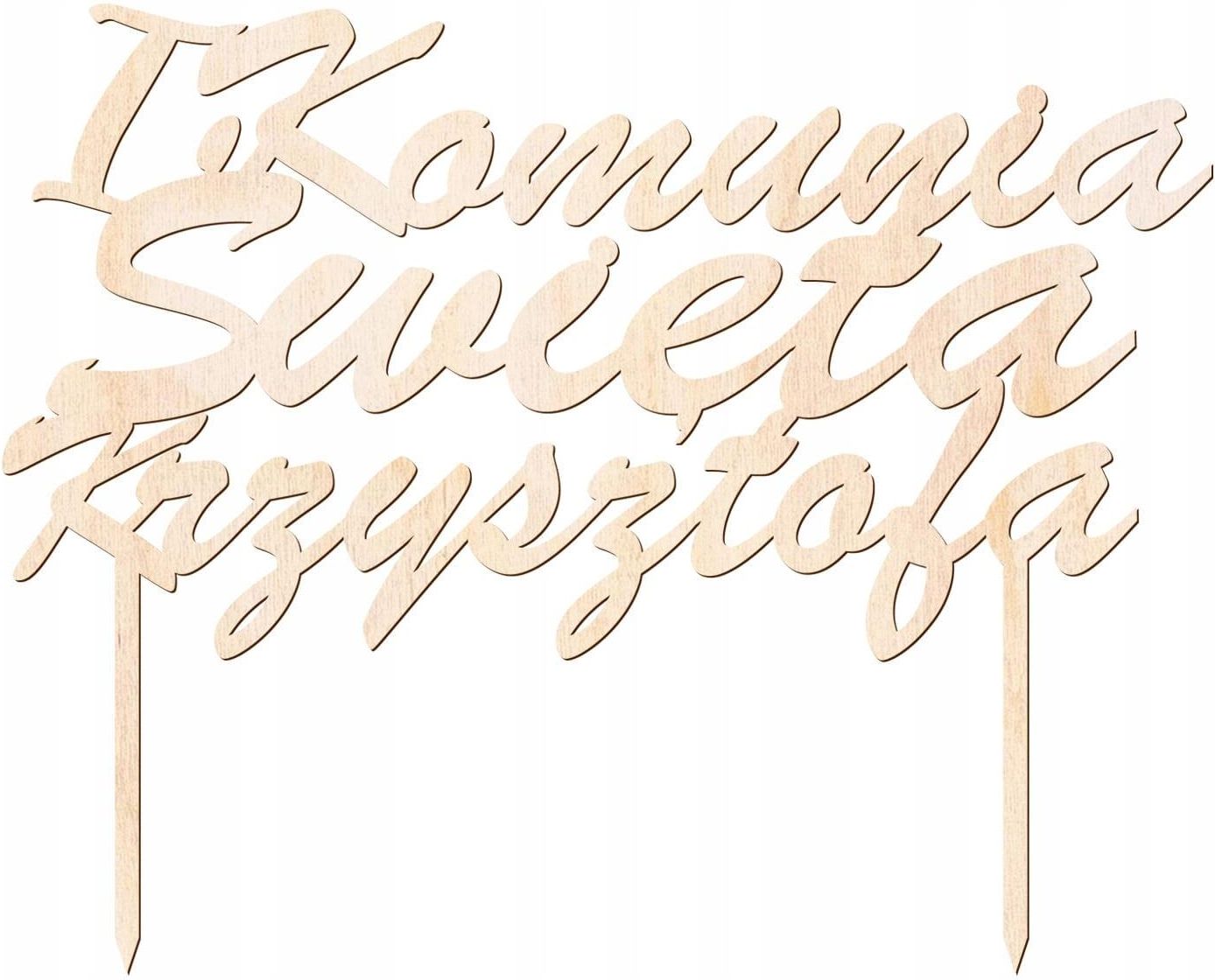 Topper drewniany personalizowany na tort I Komunia Święta - 1 szt. Kod produktu: DTIKOM02-DR Dekoracja drewniana I Komunia Święta w kolorze naturalnej sklejki, idealna dekoracja tortu. Imię w formie odmienionej można podać w notatce do zamówienia. Szerokość: 20 cm. Wysokość zależna od wybranego imienia. Opakowanie: 1 szt. Dekoracja cięta laserem, przez co przez pierwsze godziny może pachnieć typowym zapachem ciętego drewna. Przy krawędziach mogą także pozostać drobne cienie od cięcia laserowego oraz zeschniętej żywicy. Dekoracje można malować na dowolny kolor farbą do drewna, mazakami czy pisakami.