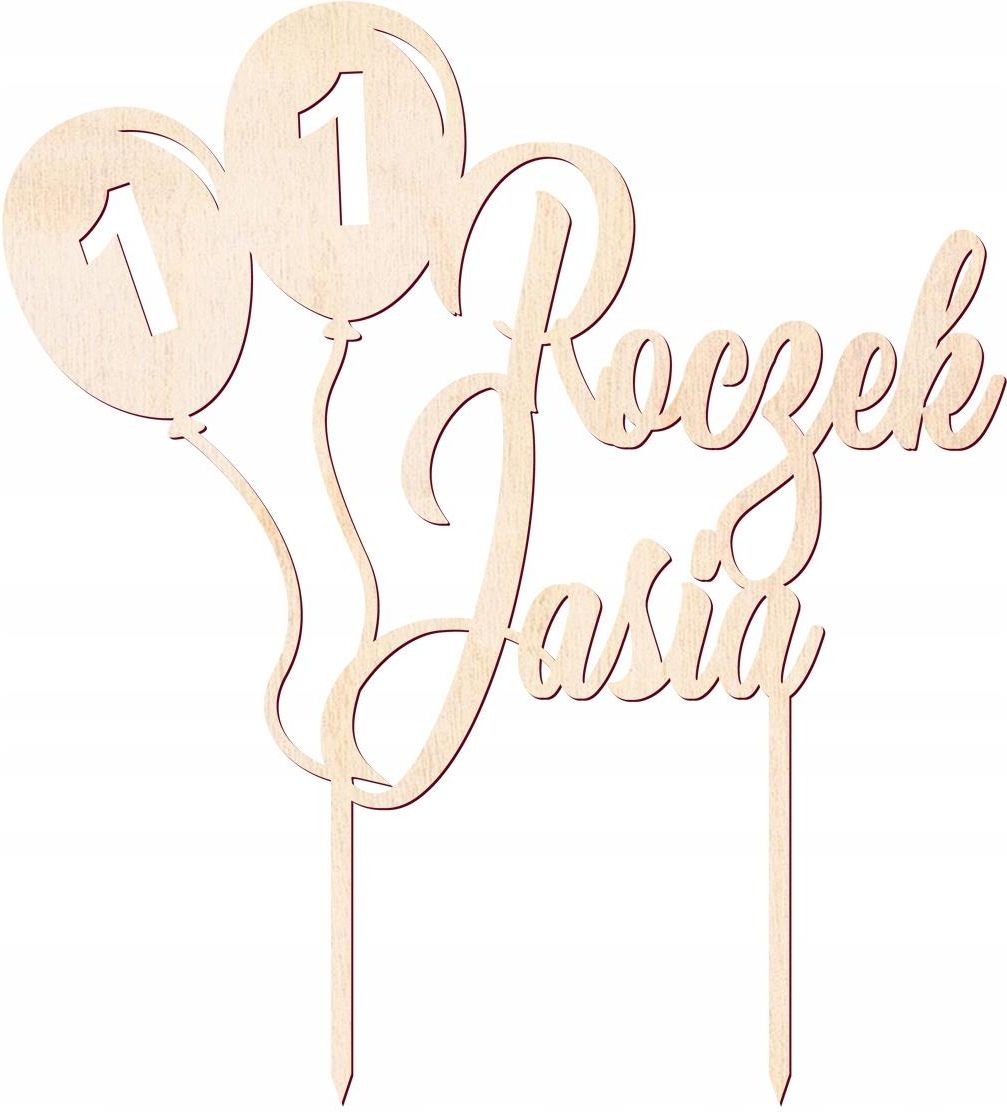 Topper drewniany na tort Baloniki - personalizowany - 1 szt. Kod produktu: DTR11-DR Drewniana dekoracja z balonikami na roczek z imieniem dziecka, idealna dekoracja tortu. Imię prosimy dopisać w notatce do zamówienia. Wysokość: 20 x 22 cm. Opakowanie: 1 szt. Prosimy o podanie imienia w formularzu opcji dostawy lub wiadomości do sprzedającego w przeciągu 1 dnia roboczego. Brak podanego imienia skutkuje wysyłką towaru z imieniem jakie jest na zdjęciu produktu. Dekoracja cięta laserem, przez co przez pierwsze godziny może pachnieć typowym zapachem ciętego drewna. Przy krawędziach mogą także pozostać drobne cienie od cięcia laserowego oraz zeschniętej żywicy. Dekoracje można malować na dowolny kolor farbą do drewna, mazakami czy pisakami.