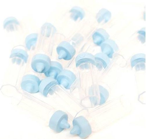 Zestaw 24 plastikowych butelek prysznicowych Mini niebieskie butelki dla niemowląt mierzą około 2,5 cm (1") długości Butelki na baby shower są uroczym dodatkiem do torebek imprezowych na bociankowym bocianku, posypywania dziecka lub imprezy ujawniającej płeć Świetnie nadaje się do dekoracji baby …