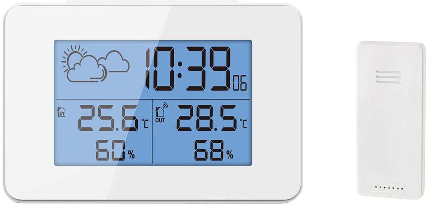 Stacja pogodowa DUWI VARIO Pomiar wilgotności: Tak Wyposażenie: stacja, nadajnik zewnętrzny bezprzewodowy Kolor: Biały Czułość aktywowania (w °C): 0.1 Przewodowy lub bezprzewodowy: Bezprzewodowy dokladny termometr / hgrometr zewnetrzny Specyfikacja techniczna Pomiar wilgotności : Tak Wyposażenie : stacja, nadajnik zewnętrzny bezprzewodowy Kolor : Biały Czułość aktywowania (w °C) : 0.1 Przewodowy lub bezprzewodowy : Bezprzewodowy Wymiary odbiornika (dług. x wys. x głęb.) (w cm) : 13x8x4 Wysokość (w cm) : 8 Głębokość (w cm) : 4 Szerokość (w cm) : 13 Alarm : Tak Programowalny : Nie Możliwość regulacji czułości aktywowania : Nie Dzienna ilość zakresów programowania : Brak Fazy księżyca : Nie Kalendarz : Nie Prędkość i kierunek wiatru : Nie Deszczomierz : Nie Automatyczne ustawianie godziny GMT : Nie Radiowy czujnik zewnętrzny : Tak Satelitarna prognoza pogody : Nie Zasilanie : 4 x baterie AAA Wyświetlanie temperatury zewnętrznej : Tak Wyświetlanie temperatury minimalnej/maksymalnej : Tak Wyświetlanie daty : Tak Podświetlany ekran : Tak Barometr : Nie Programowanie zdalne : Nie Gwarancja (w latach) : 2 Zegar : Tak Sposób montażu : Do postawienia
