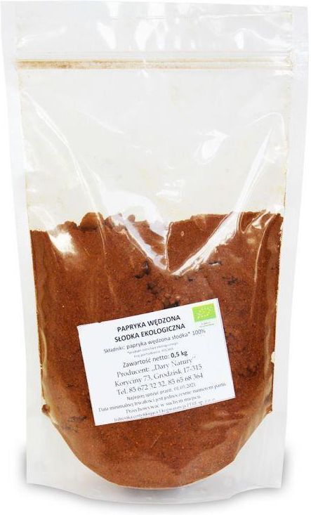 PAPRYKA SŁODKA WĘDZONA BIO 500 g - HORECA (DARY NATURY) HORECA - pozostałe SKŁADNIKI Papryka wędzona słodka* 100% (*certyfikowany składnik ekologiczny)OPISPapryka wędzona charakteryzuje się wyraźnym bardzo przyjemnym aromatem dymu wędzarniczego. Doskonale nadaje się do potraw gotowanych, duszonych, pieczonych i smażonych. Nadaje aromatu i smaku sałatkom i twarożkom.ZALECANE WARUNKI PRZECHOWYWANIA Przechowywać w suchym miejscu. Kraj pochodzenia: Polska Ilość w opakowaniu zbiorczym: 1 Wysokość opakowania jednostkowego (cm): 28.50 Głębokość opakowania jednostkowego (cm): 7.50 Masa netto (g): 500 Gwarantowany termin przydatności (w dniach): 120 Szerokość opakowania jednostkowego (cm): 18.00 Producent: HORECA - pozostałe Bez Cukru: BEZ CUKRU (w składnikach) CERTYFIKAT BIO: CERTYFIKAT BIO WEGAŃSKI: WEGAŃSKI WEGETARIAŃSKI: WEGETARIAŃSKI Producent - nazwa i adres: MIROSŁAW ANGIELCZYK DARY NATURY. KORYCINY 73. 17-315 GRODZISK BEZ GLUTENU (w składnikach): BEZ GLUTENU (w składnikach)