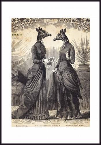 Plakat stylizowany na starą rycinę, na której dwie eleganckie kobiety, ubrane w piękne dziewiętnastowieczne suknie prowadzą konwersację. Tło ilustracji wypełnione jest przez kwiaty, rośliny doniczkowe i draperie, w rogu widać również odłożony na fotel kapelusz jednej z pań, a przy granicach grafiki znajdują się napisy po francusku. Z pozoru normalna scenka rodzajowa posiada jednak niepowtarzalny, surrealistyczny klimat, który zawdzięcza temu, że głowy dam zostały zastąpione głowami żyraf. Całość utrzymana jest w delikatnej beżowej kolorystyce, przywodzącej na myśl pergamin lub wiekowy wydruk. Parametry techniczne: Plakat jest drukowany na satynowym papierze, powlekanym wielowarstwowo o gramaturze 200 g z wykończeniem matowym. Charakteryzuje go bardzo dobre odwzorowanie kolorów oraz równomierne i jednolite krycie. Dzięki tym właściwościom, plakat przez długi czas będzie cieszył oko obserwatorów. Do plakatu nie jest dołączona ramka. Wizualizacje są tylko prezentacją projektu, mogą nie odzwierciedlać rzeczywistego rozmiaru, przed dodaniem do koszyka, prosimy o sprawdzenie wymiaru. Pamiętaj również, że obraz który widzisz, jest w palecie RGB, technologia druku CMYK, zatem mogą nastąpić różnice w kolorze, są one zazwyczaj subtelne.