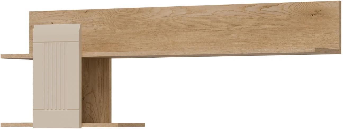 Półka wisząca uniwersalna ryflowany panel Dąb Cremona Kaszmir MILTON ML10 MILTON ML10 Dwupoziomowa półka wisząca L/P ML10 pochodząca z kolekcji Milton dzięki swojej prostej, ale atrakcyjnej formie świetnie sprawdzi się w minimalistycznej aranżacji sypialni, domowego biura, jadalni, salonu czy pokoju dziennego – wszędzie tam, gdzie liczy się funkcjonalność, porządek i wyrazista estetyka. Półka oferuje praktyczną przestrzeń do wyeksponowania serii książek, ciekawych dekoracji czy drobnych przedmiotów codziennego użytku. Model ML10 wyróżnia się ponadczasowym designem, łączącym ozdobny frezowany panel w kaszmirowym kolorze o matowym wykończeniu z korpusem wykonanym w naturalnym i ciepłym dekorze dąb cremona torro, który doskonale odnajdzie się zarówno w nowoczesnych, jak i bardziej klasycznych wnętrzach. Wysokiej jakości płyta meblowa Front półki uniwersalny L/P Kolekcja Milton składa się z 12 segmentów Mebel występuje w 4 wariantach kolorystycznych Wymiary Szerokość: 138 cm Głębokość: 23 cm Wysokość: 46,5 cm Waga towaru z opakowaniem: 9,70 kg Wykończenie Półka została starannie wykonana z wysokogatunkowej płyty wiórowej pokrytej laminatem w dekorze dąb cremona torro, natomiast panel MDF z dekoracyjnymi ryflowaniami wykończono w matowym kaszmirze. Użyte materiały są solidne i odporne na czynniki zewnętrzne, a także łatwe w utrzymaniu czystości, co gwarantuje bezpieczeństwo podczas codziennego użytkowania mebla i jego trwałość na lata. Szczegóły produktu Nazwa kolekcji: milton Kod / symbol producenta: ml10 Styl: nowoczesny Ilość paczek produktu: 2 Wyposażenie: instrukcja montażu / akcesoria montażowe Montaż: do samodzielnego montażu Bryła uniwersalna: tak (lewostronna / prawostronna) Wykonanie Korpus: płyta meblowa16 mm Blat korpusu: płyta meblowa 16 mm Front: płyta meblowa MDF 18 mm Kolorystyka Korpus: dąb cremona torro Front: kaszmir mat Galeria zdjęć