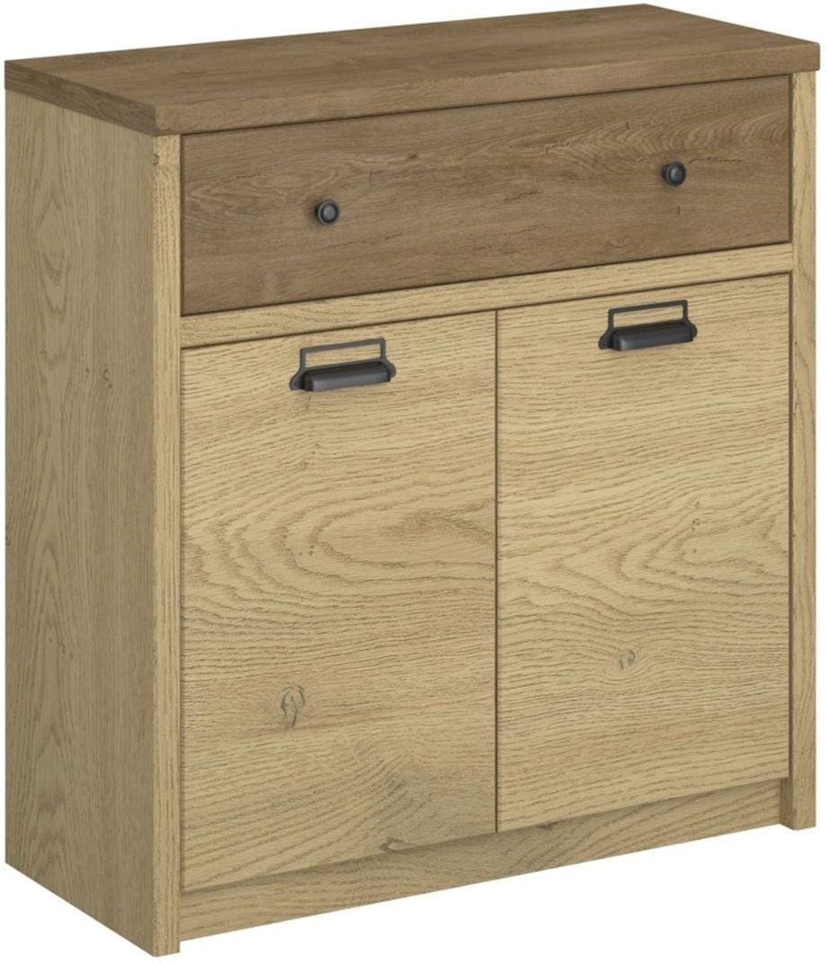 Komoda dwudrzwiowa z szufladą Szafka loft Dąb cremona / lefkas DENZEL Komoda z kolekcji DENZEL Komoda Denzel to stylowy mebel do salonu, sypialni lub pokoju nastolatka, który łączy prostą formę z wyrazistym stylem loftowym. Zestawienie dekorów dąb cremona i dąb lefkas wprowadza ciepło i naturalny akcent do pomieszczenia. Metalowe uchwyty podkreślają nowoczesny design, a szuflada w kontrastowym kolorze stanowi charakterystyczny element mebla. Ta klasyczna komoda z drzwiczkami i szufladą doskonale uzupełni aranżację nowoczesnego wnętrza. Mebel sprawdzi się do przechowywania wszelakich drobiazgów, tekstyliów czy dokumentów. Subtelne przełamanie dwóch kolorów Dwa rodzaje designerskich uchwytów Prosta i masywna bryła w stylu loft System DENZEL składa się z 17 segmentów Wymiary Szerokość: 86 cm Głębokość: 36,5 cm Wysokość: 90,5 cm Wnętrze Dwudrzwiowy mebel wyposażony jest w dwie zamykane wnęki oraz szufladę z pełnym wysuwem. Otwierany jest za pomocą wygodnych metalowych uchwytów. Wykończenie Mebel wykonano z wysokogatunkowej płyty meblowej pokrytej laminatem w dwóch odcieniach dębu cremona oraz lefkas. Użyte materiały są solidne, niezawodne i odporne na codzienne zużycie, przez co zapewniają długotrwałe użytkowanie mebla, zachowując przy tym swój nienaganny wygląd. Szczegóły produktu Nazwa systemu: DENZEL Ilość drzwi: 2 Ilość półek: 1 Ilość szuflad: 1 Ilość wnęk zamkniętych: 2 Prowadnice: kulkowe, pełen wysuw Uchwyt: metalowy Montaż: mebel w paczkach do samodzielnego montażu Wykonanie Korpus: płyta meblowa laminowana pogrubiana Blat: płyta meblowa laminowana pogrubiana Front: płyta meblowa laminowana Kolorystyka Korpus: dąb cremona Blat: dąb lefkas Front: dąb cremona / dąb lefkas Galeria zdjęć