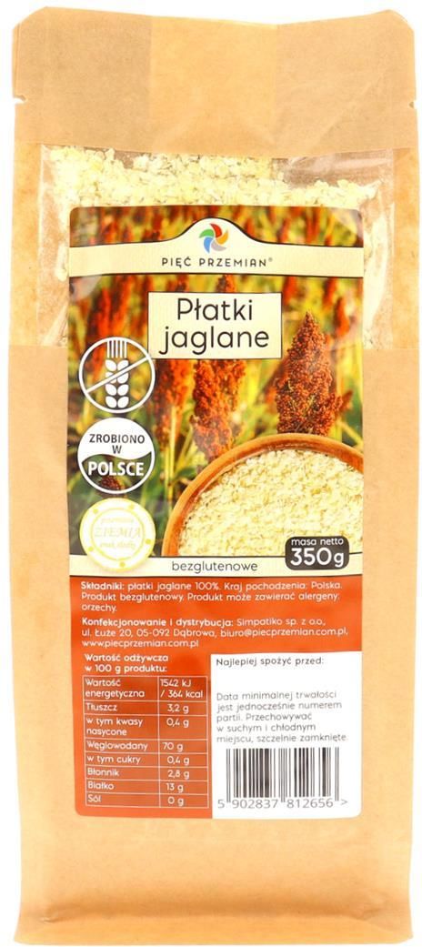 Płatki jaglane bezglutenowe Płatki jaglane bezglutenowe Pięć Przemian to w pełni naturalny produkt powstały z najwyższej jakości polskiego prosa. To doskonały wybór dla osób dbających o zdrową, zrównoważoną dietę. Ich delikatny smak i lekka konsystencja sprawiają, że świetnie komponują się zarówno ze słodkimi, jak i wytrawnymi dodatkami. Bogactwo składników odżywczych Jaglanka to jedno z najstarszych i najcenniejszych zbóż w diecie człowieka. Płatki jaglane są naturalnym źródłem białka, błonnika i witamin z grupy B, które wspierają prawidłowe funkcjonowanie układu nerwowego oraz metabolizmu. Zawierają również żelazo, magnez i krzem, minerały pomagające utrzymać zdrowe włosy, skórę i paznokcie. Skład i wartości odżywcze Składniki: Płatki jaglane 100%. Kraj pochodzenia: Polska. Wartość odżywcza w 100 g produktu: Wartość energetyczna: 1542 kJ / 364 kcal Tłuszcz: 3,2 g w tym nasycone: 0,4 g Węglowodany: 70 g w tym cukry: 0,4 g Białko: 13 g Sól: 0 g Dodatkowe informacje Masa netto: 350 g Producent: Pięć Przemian Dystrybutor: Simpatiko sp. z o.o., ul. Łuże 20, 05-092 Dąbrowa Przechowywać w suchym i chłodnym miejscu Może zawierać śladowe ilości orzechów
