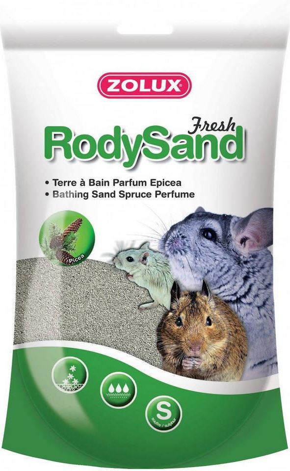ZOLUX Piasek Do Kąpieli Rody Sand 2 l Sosnowy Naturalny, perfumowany piasek do kąpieli dla szynszyli, koszatniczek i skoczków. Suchy produkt higieniczny niezbędny dla dobrego samopoczucia zwierzątka i pielęgnacji jego sierści. Piasek składa się z glinki wzbogaconej mikronizowaną siarką organiczną, sprzyjającą lepszej higienie podszerstka. Najwyższa jakość wchłaniania - wysoka glanurometryczność. Piasek jest bardzo chłonny, dodatkowo eliminuje kurz, pochłania zapachy (nadmiar sebum u szynszyli), dogłębnie czyści podszerstek, pozwalając uniknąć chorób skóry. Piasek przyjemny w dotyku a jego delikatna konsystencja jest idealna dla utrzymania miękkiej i błyszczącej sierści. Nie podrażnia skóry zwierzątka. Delikatny zapach sosny delikatnie rozprzestrzenia się w klatce zwierzątka Sposób użycia: Wsypać do kuwety warstwę ok. 3-4 cm piasku do kąpieli. Regularnie usuwać ewentualne zabrudzenia. Całkowicie wymienić piasek raz na tydzień, zależnie od stanu jego zabrudzenia. Przechowywać w czystym i suchym miejscu. Czyścic kuwetę i uzupełniac piasek w razie potrzeby.