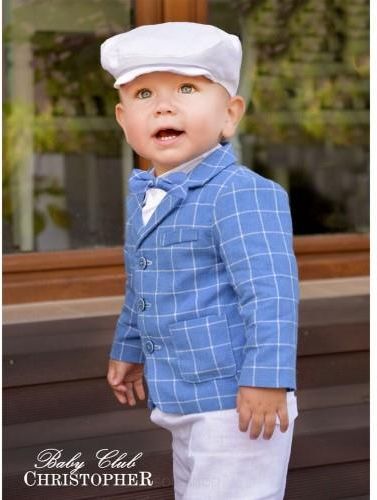 6444 Christopher - Garnitur granatowy w kratkę z czapką r. 68. Garnitur składa się z : marynarki, koszulo-body, muszki, spodni, kaszkietu.