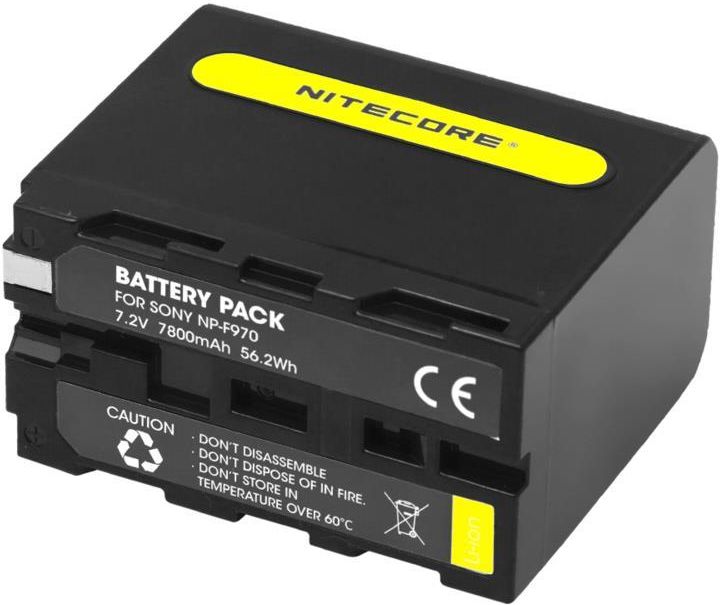 Akumulator Nitecore NP-F970 7800 mAh Akumulator Nitecore NP-F970 to zaawansowane źródło zasilania o pojemności 7800 mAh. Przeznaczony jest do kamer Sony i innych urządzeń kompatybilnych ze standardem NP-F. Zapewnia stabilne zasilanie i posiada zabezpieczenia przed przeładowaniem, nadmiernym rozładowaniem lub zwarciem. Specyfikacja: Pojemność: 7800 mAh Napięcie: 7,2 V Wymiary: ok. 70,7 x 39,3 x 59,7 mm Waga: ok. 320 g