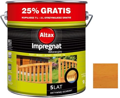 Altax Impregnatem można malować drewno nieoszlifowane, strugane i oszlifowane. Aby je skutecznie zabezpieczyć należy nanieść co najmniej 2 warstwy preparatu. Drewno użytkowane na zewnątrz lub takie, które jest narażone na biokorozję powinno być wcześniej zabezpieczone za pomocą Impregnatu Gruntującego Penetrin lub Impregnatu do drewna konstrukcyjnego Boramon C30 w wersji bezbarwnej. Oto kolejne kroki, które musimy wykonać, aby efekt końcowy nas zadowalał: 1. Należy zadbać, aby drewno było suche i czyste. 2. Otworzyć puszkę i dokładnie wymieszać preparat (mieszanie należy powtarzać, co kilka minut podczas malowania). Nakładanie pierwszej warstwy. 3. Drewno malować nakładając cienką warstwę impregnatu, wcierając go za pomocą pędzla lub tamponu malarskiego wzdłuż słojów. 4. Po 5-10 minutach można przetrzeć pomalowane drewno suchym pędzlem, aby idealnie rozprowadzić pigmenty (tylko w wersjach barwnych). 5. Pozostawić drewno do wyschnięcia na ok. 24 h. Nakładanie drugiej warstwy. 6. Malować drewno dokładnie tak samo, jak przy warstwie pierwszej – nakładając cienką warstwę preparatu. 7. Pozostawić drewno do całkowitego wyschnięcia na ok. 24 h. 8. Jeżeli chcemy nałożyć trzecią warstwę robimy to dokładnie tak, jak nakładaliśmy poprzednie warstwy 9. Pozostawić do wyschnięcia. Cechy produktu: zapewnia 5 lat aktywnej ochrony, trwale zabezpiecza drewno przed czynnikami atmosferycznymi: wilgocią, wodą, śniegiem i promieniowaniem UV, wzmacnia powierzchniową strukturę drewna, nadaje szlachetny kolor zachowując naturalny rysunek drewna, wersje barwne impregnatu skutecznie chronią przed promieniowaniem UV, które powoduje rozpad celulozy i szarzenie drewna (wersję bezbarwną należy stosować tylko wewnątrz pomieszczeń), Altax Impregnat dekoracyjny do drewna posiada ważny Atest Higieniczny.