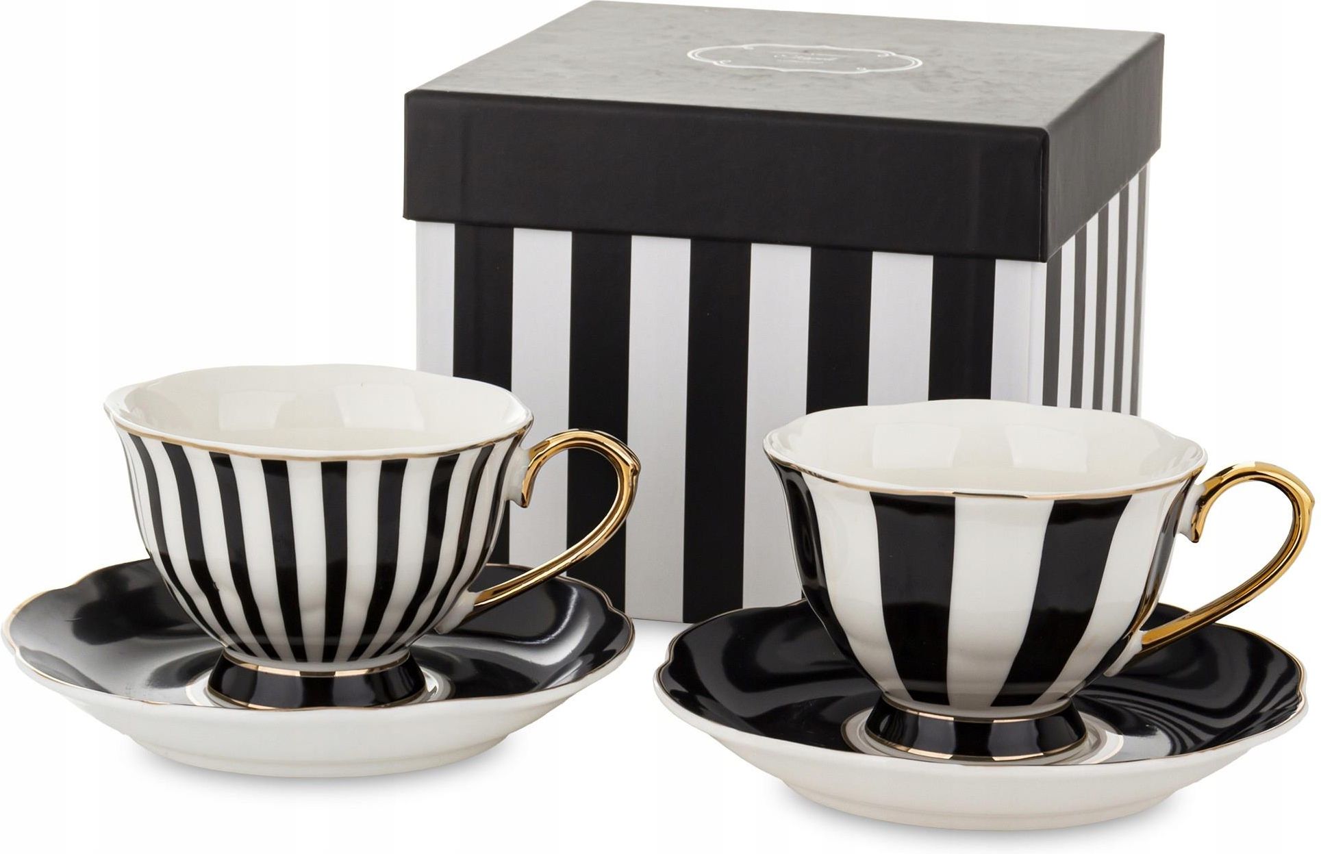 Porcelanowe filiżanki 2 szt w pudełku Oryginalny, porcelanowy zestaw w czarno-białe paski, ozdobiony delikatnym, złotym ornamentem Może pełnić funkcję dekoracyjną i użytkową Dopuszczony do kontaktu z żywnością Pojemność filiżanki: ok. 220 ml Średnica filiżanki: 9,5 cm Szerokość z uchem: 12 cm …