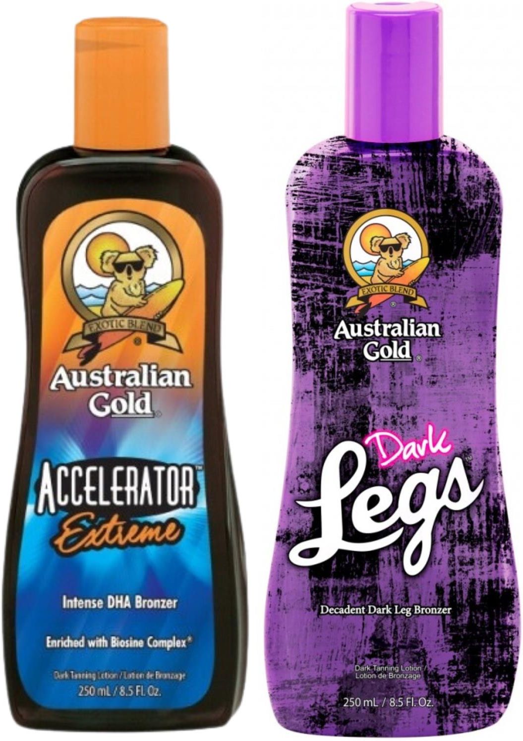 Australian Gold Accelerator Extreme + Dark Legs Do NógAustralian Gold Accelerator ExtremeUnikatowe połączenie naturalnych i kosmetycznych bronzerów dla najlepszego brązowego rezultatu opalania.Ekstrakty z cykorii i czarnych orzechów włoskich zapewniają natychmiast widoczny, ciemny kolor opalenizny, …