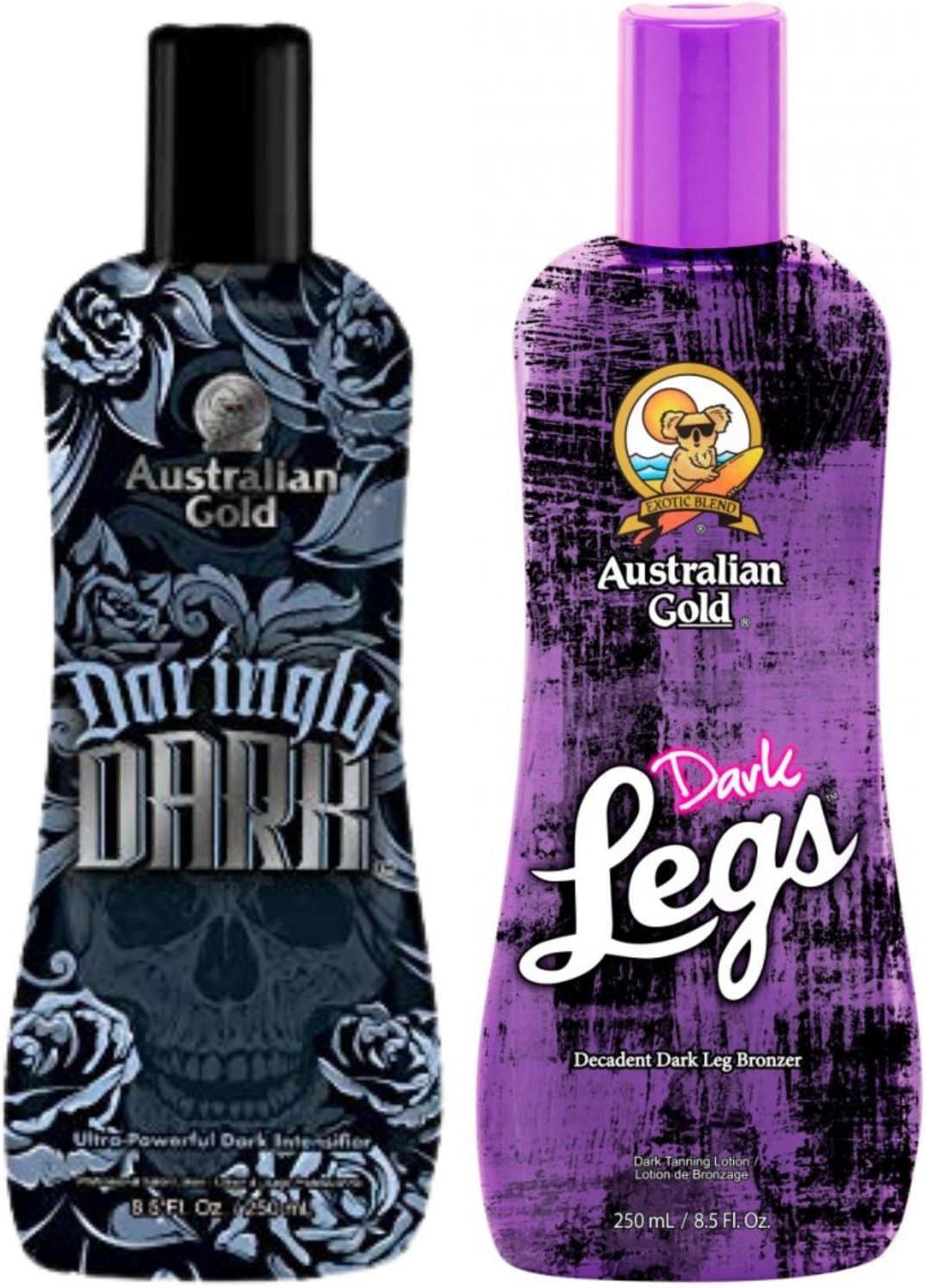 Australian Gold Daringly Dark + Dark Legs Do NógAustralian Gold Daringly DarkDaringly Dark to niezwykle mocny przyspieszacz potęgujący powstanie brązowejOpalenizny poprzez m.in. Tyrozynę i Glicerynę, które stymulują produkcjęMelaniny w celu uzyskania szybkiego, równomiernego i ciemnego koloru.Skin Soothing Blend (Aloes, Masło Shea i Męczennica Błękitna) nawilża i łagodzi skórę, a olej z nasion konopi doskonale ją odżywia i pielęgnuje.Składniki anti-aging takie jak „Vitamin Elixir” (witaminy A, B5 i E) oraz Skincare Conditioners (kokos, słonecznik i oliwa z oliwek) zapewniają maksymalne nawilżenie, zwalczają drobne linie i zmarszczki oraz zawierają bogactwo przeciwutleniaczy. Kofeina dodatkowo ujędrni skórę.Z formułą „Tan Fresh”Zapach „Fruity Coconut”Pojemność: 250mlAustralian Gold Dark Legs Balsam Do Opalania Nóg 250mlDark Legs to produkt stworzony specjalnie z myślą o trudno opalających się nogach.Dzięki naturalnej formule „LEGit Bronzers” uzyskasz w ekspresowym tempie przepięknie opalone nogi.Nowy „Silky Softness Complex” sprawi, że Twoje nogi będą gładkie i miękkie w dotyku, a kompozycja „Perfection Blend”ujędrni skórę.Dark Legs zawiera substancje brązujące o natychmiastowym i o opóźnionym działaniu, aby zapewnić ciemną, równą opaleniznę, która utrzyma się wyjątkowo długo.Zapach: Fruity Floral Właściwości:Ekspresowo opalone nogiNogi gładkie i miękkie w dotykuFormuła ujędrniająca skórę