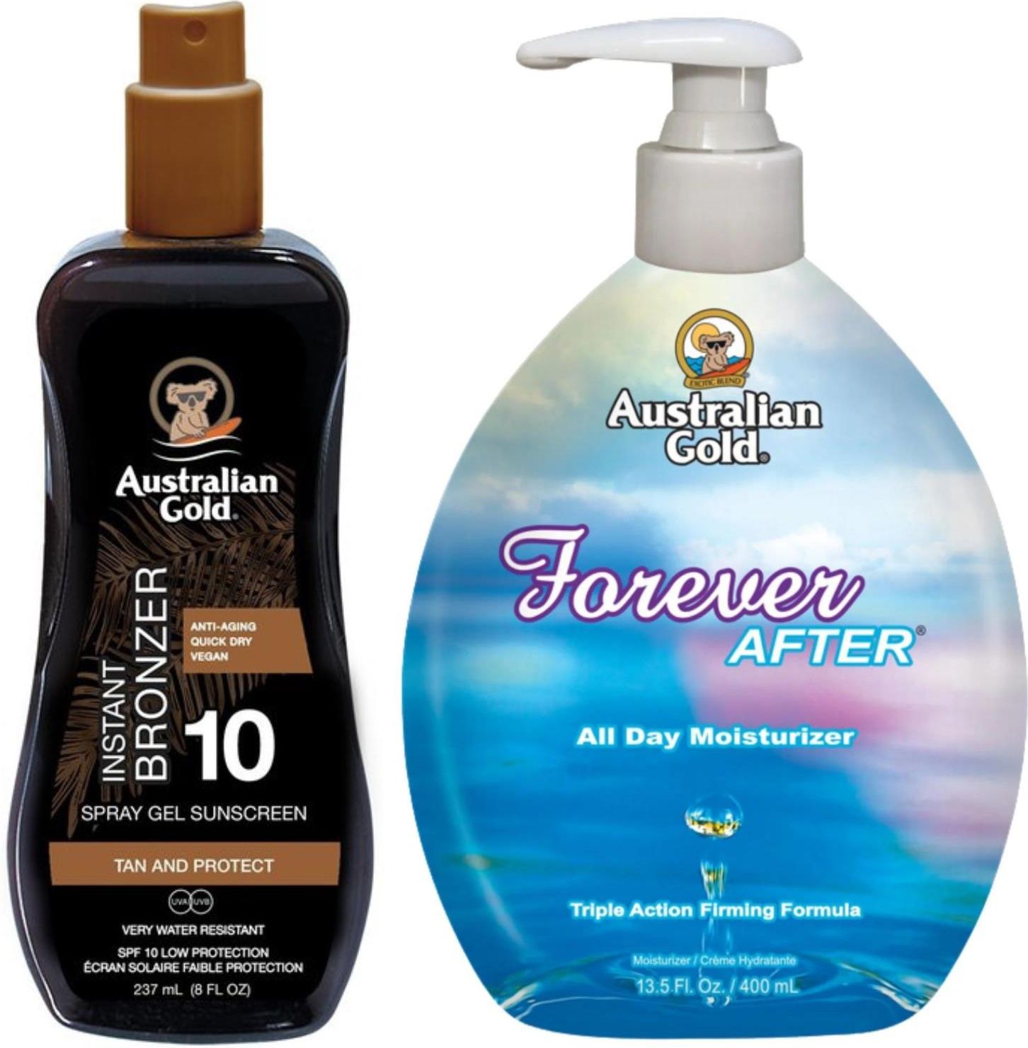 Australian Gold Żel W Sprayu Z Bronzerem SPF10 + Forever After 400mlAustralian Gold Żel W Sprayu Z Bronzerem SPF10 Australian Gold - Spray Gel with Bronzer SPF15 - żel w sprayu do opalania, zawierający karmel, który daje efekt opalonej skóry. Zawiera filtry chemiczne, które chronią zarówno przed promieniowaniem UVA i UVB. Sok z aloesu koi i nawilża skórę, a olej z drzewa herbacianego działa antyseptycznie i przeciwzapalnie. Kosmetyk zawiera również ekstrakt ze śliwki kakadu, który jest bogatym źródłem witaminy C o działaniu antyoksydacyjnym, wyrównującym koloryt skóry i chroni skórę przed szkodliwym działaniem wolnych rodników.Produkt zawiera: Filtry chemiczne - chronią skórę przed promieniowaniem uv, Olej z drzewa herbacianego - działa antyseptycznie i przeciwzapalnie,Sok z aloesu - nawilża i koi skórę,Karmel - daje efekt opalonej skóry, jest naturalnym bronzerem,Ekstrakt ze śliwki kakadu - bogate źródło witaminy c, działa antyoksydacyjnie, chroni przed działaniem wolnych rodników.Działanie produktu:Wyrównuje koloryt skóry, Chroni przed promieniowaniem uv, Nawilża, Działa antyoksydacyjnie. Nasz kosmetolog poleca ten produkt w przypadku:Każdego rodzaju skóry.Sposób aplikacji: Odpowiednią ilość produktu rozprowadź na skórze około 20 minut przed rozpoczęciem opalania. Aplikuj ponownie co około 2 godziny.Przed pierwszym użyciem wykonaj próbę uczuleniową. Zajrzyj do naszego wpisu o Próbie uczuleniowej, aby dowiedzieć się więcej.Australian Gold Forever After Balsam Po Opalaniu 400mlBalsam zapewnia 24 godzinne nawilżenie, jak i utrwalenie opalenizny dzięki zawartości ekstraktu z konopi indyjskich.Zawiera formułę o działaniu wyszczuplającym, modelującym, a także zapobiega starzeniu się skóry.Skóra jest ujędrniona, a jej kondycja jest poprawiona. Kwasy tłuszczowe zawarte w kosmetyku utrzymują nawilżenie skóry przed 24 godziny.5 prawdziwych efektów:WyszczuplenieUjędrnieniePoprawa kondycji skóryNawilżenieOchronaDla kogo?Dla osób, które chcą chronić oraz nawilżyć swoją skórę.Dla osób, które chcą zapobiec starzeniu się skóry.Pojemność: 400mlDo stosowania na co dzień również dla nie opalających się, balsam na silne właściwości nawilżające,ochraniające, ujędrniające i wyszczuplające dzięki swojemu bogatemu składowi