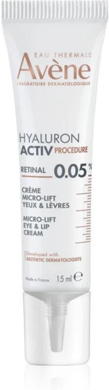 Avène Hyaluron Activ Procedure Micro-Lift Eye & Lip Cream 0.05% Retinal, 15 ml, Kremy i żele do oczu dla kobiet, Skład: kwas hialuronowy – wiąże dużą ilość wody, intensywnie nawilża retinol – pochodna witaminy A, skutecznie zwalcza starzenie się skóry, wspomaga złuszczanie i tym samym pomaga wygładzić teksturę, stymuluje produkcję włókien kolagenowych i elastyny, dzięki czemu wygładza zmarszczki, napina skórę i przywraca jej elastyczność niacynamid – wspomaga rozjaśnienie skóry, redukcję przebarwień, ujednolicenie kolorytu i wygładzenie nierównej tekstury, pomaga wzmocnić barierę ochronną skóry, a tym samym poprawić poziom nawilżenia skóry woda termalna – odświeża, łagodzi, dostarcza minerałów i innych składników odżywczych, pomaga wyrównać pH skóry, wspomaga szybszą regenerację, działa przeciw podrażnieniom, zmiękcza i rozjaśnia bez środków perfumujących produkt wegański