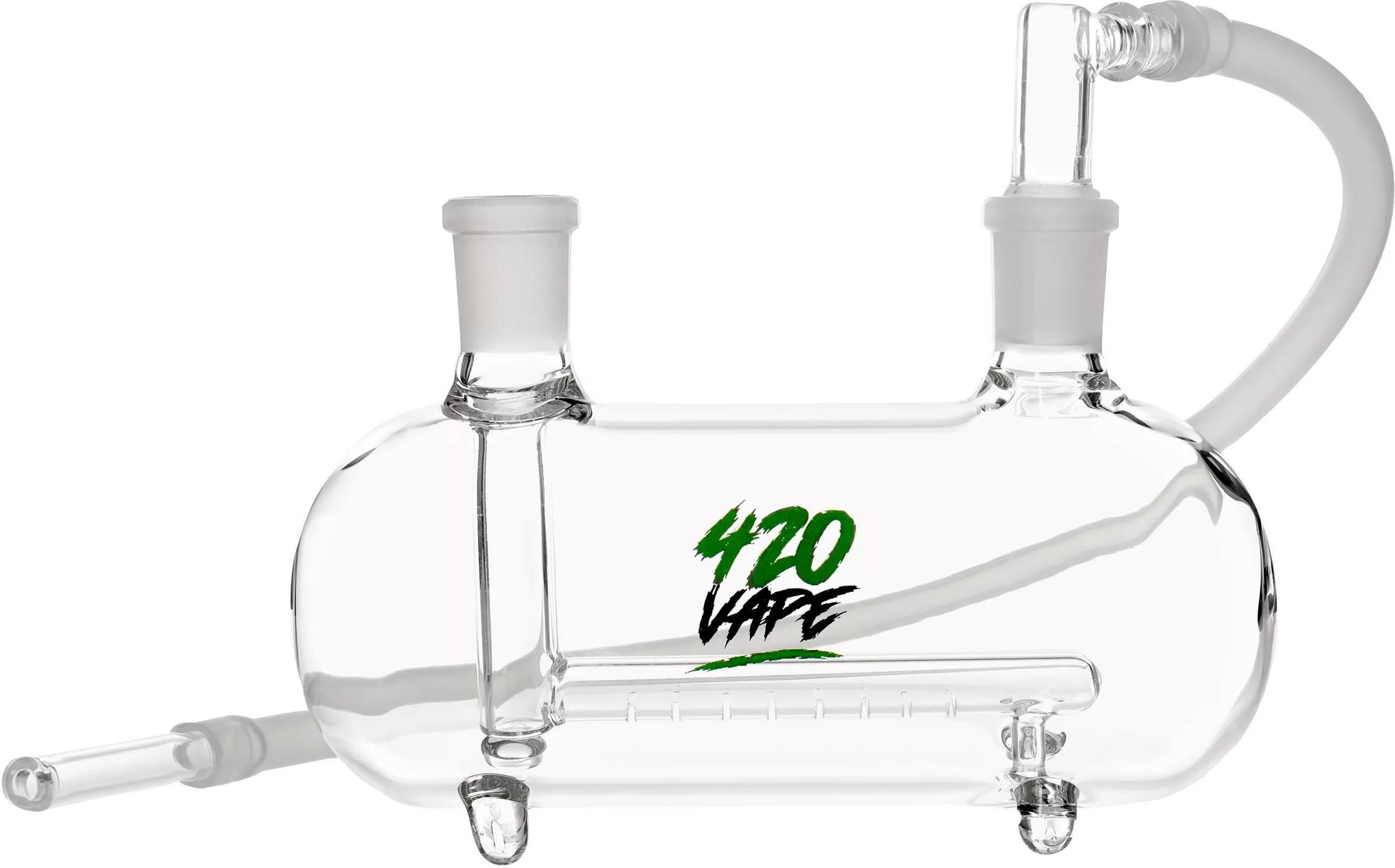 Bongo Ubot 420VAPE z dyfuzorem szlif 14.5 mm Unikalna fajka wodna Ubot 420VAPE do połączenia z waporyzatorem. Wykonana z wysokiej klasy borokrzemowego szkła. Zaopatrzona we wbudowany dyfuzor filtrujący i silikonowy wężyk wykończony szklanym ustnikiem. Szlif: 14.5 mm