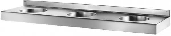 umywalka zbiorowa mocowana na ścianie, 3 stanowiska, 1800 x 500 mm z niewysoką ścianką, aby chronić powierzchnię ściany przed rozpryskami wody i podnieść standard higieny średnica wewnętrzna umywalek: 310 mm bakteriostatyczny Inox 304 wykończenie satynowe grubość Inoxu: 1,5 mm wykończenie …