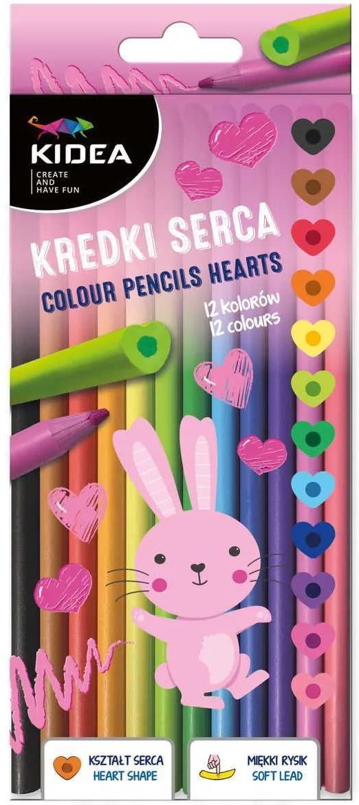 Kidea Kredki ołówkowe serca 12 kolorów Kredki ołówkowe w kształcie serduszek w 12 intensywnych kolorach. Miękki rysik sprawia, że kolorowanie i rysowanie jest jeszcze większą przyjemnością, a ich uroczy kształt i wyraziste kolory udekorują pojemnik na kredki lub piórnik. Mimo ich serduszkowego kształtu, kredki bez problemu można naostrzyć zwykłą temperówką. Kredki sprawdzą się jako wyjątkowy prezent dla każdego ucznia.