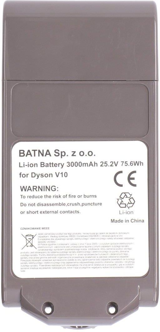 Przywróć pełną moc swojemu odkurzaczowi Dyson Bateria Dyson V10 25.2V 3000mAh to solidna alternatywa dla zużytego akumulatora, zapewniająca przywrócenie pełnej mocy Twojemu odkurzaczowi. Dzięki zwiększonej pojemności 3000mAh, odkurzacz będzie działał dłużej, pozwalając na efektywniejsze sprzątanie. Wymiana baterii Dyson V10 jest szybka i bezproblemowa, co pozwala oszczędzić czas i energię. Wydajność i większa moc Bateria Dyson V10 25.2V 3000mAh zapewnia wydajność na poziomie oryginalnych akumulatorów. Zwiększona pojemność pozwala na dłuższą pracę odkurzacza na jednym ładowaniu, co jest szczególnie przydatne w dużych pomieszczeniach. Dzięki tej baterii, Twój odkurzacz będzie mógł działać z pełną mocą przez dłużej, co zwiększa komfort użytkowania. Szybka wymiana i łatwa instalacja Wymiana akumulatora Dyson V10 jest niezwykle prosta. Dzięki systemowi typu click, wystarczy kliknąć, aby wymienić stary akumulator na nowy, bez potrzeby używania narzędzi. Cały proces jest szybki i nie wymaga dodatkowych umiejętności, co pozwala zaoszczędzić czas i energię. Kilka powodów, dla których warto wymienić baterię Dłuższy czas działania – dzięki nowemu akumulatorowi Twój odkurzacz będzie działał bez potrzeby częstego ładowania, co pozwala zaoszczędzić czas i zwiększa wygodę użytkowania. Maksymalna moc – po wymianie baterii odkurzacz działa z pełną wydajnością przez dłużej, co poprawia jakość czyszczenia i pozwala dotrzeć do trudno dostępnych miejsc. Bezpieczeństwo urządzenia – nowy akumulator ma wbudowane systemy ochrony przed przegrzaniem oraz zwarciem, co zabezpiecza Twój odkurzacz przed uszkodzeniem. Brak przerw w pracy – nowa bateria eliminuje problem nagłych wyłączeń urządzenia spowodowanych wyczerpaniem starego akumulatora, co pozwala na ciągłą i niezakłóconą pracę. Ekonomiczność – wymiana akumulatora to tańsza alternatywa niż zakup nowego odkurzacza, co pozwala zaoszczędzić pieniądze na dłuższą metę. Model: Dyson V10 25.2V 3000mAh Pojemność: 3000mAh Napięcie: 25.2V Typ akumulatora: Li-ion Kompatybilność: Dyson Cyclone V10 Animal, V10 Absolute, V10 Motorhead, V10 Fluffy, V10 Total Clean