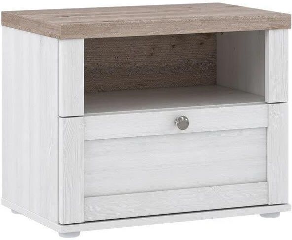 Jasna szafka nocna Iloppa, od Meble Forte, stanowi funkcjonalne uzupełnienie wyposażenia wnętrza sypialni, oferując praktyczny blat i miejsce do przechowywania. Użytkownik może postawić na niej lampkę nocną lub budzik, a w otwartej wnęce i funkcjonalnej szufladzie przechowa wygodnie wszystkie przedmioty, które warto mieć pod ręką w czasie wypoczynku. Czym charakteryzuje się szafka nocna Iloppa? Szafka nocna z szufladą z kolekcji Iloppa została wykonana z wysokiej jakości płyty meblowej, wzmocnionej obrzeżami ABS. Mebel jest dzięki temu odporny na uszkodzenia mechaniczne, a także łatwy do utrzymania w czystości i niewymagający w pielęgnacji. Wnętrze szafki zagospodarowano za pomocą otwartej wnęki i praktycznej szuflady na drobne akcesoria. Dzięki temu użytkownik może łatwiej utrzymać porządek wśród przedmiotów, które lubi mieć pod ręką wieczorem i o poranku. Atutem mebla jest też poręczny, metalowy uchwyt, który pozwala wysuwać szufladę bez pozostawiania śladów na jej jasnym froncie. Jak wygląda szafka nocna do sypialni Iloppa? Prezentowana elegancka szafka nocna do sypialni z kolekcji Iloppa to mebel wybarwiony na dwa stylowe dekory - Dąb Nelson i Dąb Śnieżny. Szafka o jasnym wykończeniu pozwala rozświetlić i optycznie powiększyć pomieszczenie, a także dodać mu przytulności i ciepła. Mebel zaprojektowano w stylu prowansalskim. Jego bryła wyróżnia się więc ozdobnym ramkowym frontem, który nadaje wnętrzu klasę i szyk. Wymiary szafki nocnej Szerokość: 55,4 cm Głębokość: 34,4 cm Wysokość: 45 cm