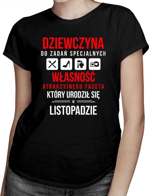 Dziewczyna do zadań specjalnych - własność atrakcyjnego faceta urodzonego w listopadzie Damska koszulka z nadrukiem. Uszyta z przyjemnej w noszeniu bawełny, świetnie sprawdzi się w codziennym użytkowaniu także jako pomysł na prezent dla kobiety z klasą.