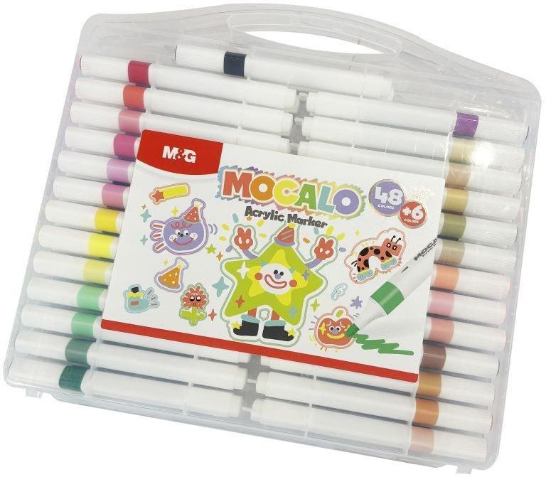 M&G Markery Akrylowe 48+6 Kolory Mocalo 794731 Zestaw markerów akrylowych Mocalo M&G to praktyczne narzędzie do kreatywnego zdobienia i precyzyjnego malowania. Sprawdzi się zarówno w projektach hobbystycznych, jak i w pracach dekoracyjnych, gdzie liczy się intensywny kolor, dobra kontrola linii oraz trwały efekt. Końcówka o okrągłym profilu umożliwia prowadzenie równej kreski o grubości ok. 1 mm, co ułatwia wykonywanie konturów, napisów, detali i drobnych elementów graficznych. Do zdobienia i malowania na większości powierzchni takich jak: drewno, tektura, papier, płótno, szkło, guma, plastik, stal, kamień, styropian. Wodoodporny i szybkoschnący. Farba akrylowa znajdująca się w markerze jest odporna na światło słoneczne, charakteryzuje się wysoką przyczepnością do podłoża. W zestawie znajdziemy 48 + 6 kolorów
