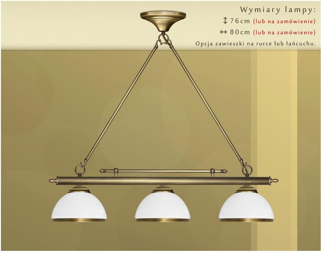 Lampa mosiężna nad stół z trzema kloszami. - Wykonana w całości z elementów z pełnego mosiądzu. - Wykończenie: złota patyna. - Wysokość oraz długość lampy na zamówienie. - Rodzaj zawieszki do wyboru: na rurkach lub na łańcuchu. - Klosze szklane z ramką mosiężną do wyboru: białe w połysku , kremowe matowe lub zielone matowe. - Wymiary: wysokość 76cm (lub inna na zamówienie), długość 80cm (lub inna na zamówienie), średnica klosza 19cm.- Typ mocowania: wspornik (montowany do sufitu na dwóch wkrętach) - Na zamówienie: inna ilość kloszy oraz ich średnica; zmiana rur mosiężnych na ryflowane. - Żródło światła: 3xE27 (żarówki tradycyjne/żarowe o mocy max. 60W) lub żarówki energooszczędne albo LED o większej mocy (np. odpowiednik 100W). Lampa jest fabrycznie nowa, wyprodukowana w Polsce. Gwarancja: 24 miesiące. Seria J - zobacz wszystkie lampy