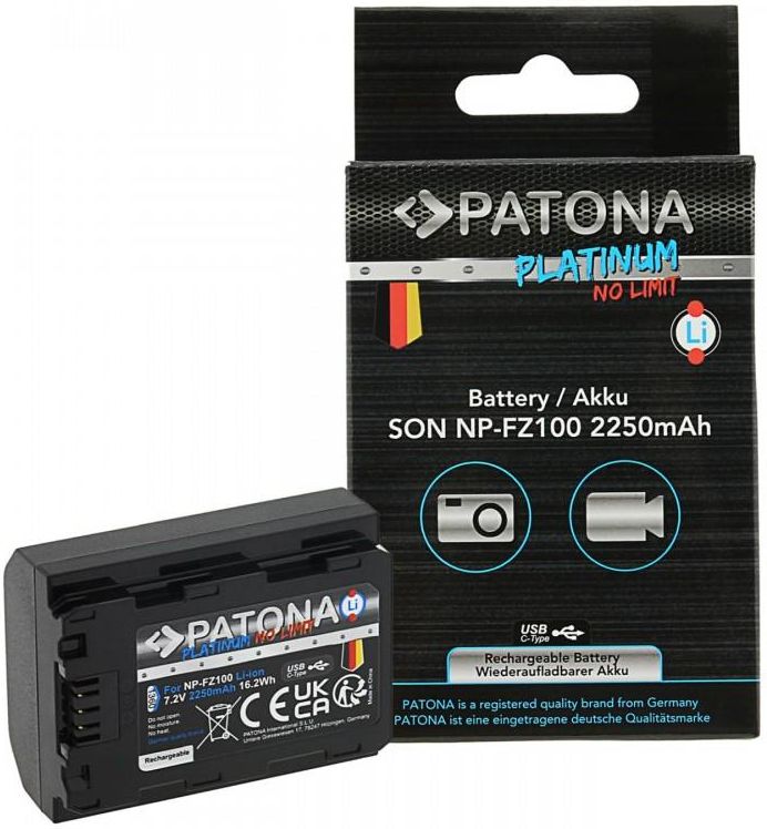 PATONA Platinum Sony NP-FZ100 z USB-C Zamiennik akumulatora NP-FZ100 do aparatów Sony z wbudowanym portem ładowania USB-C Patona Platinum NP-FZ100 to uniwersalne źródło energii, dzięki któremu zasilisz nowe modele aparatów cyfrowych marki Sony z serii Alpha A7, A9.To najnowszy model, w którym inżynierowie firmy Patona zintegrowali wejście typu USB-C. Dzięki temu rozwiązaniu, można ładować tę baterię za pomocą kabla USB-C i dowolnego zasilacza.Akumulatory z serii Platinum zostały wyposażone w innowacyjne, markowe ogniwa litowo-jonowe. Seria ta została stworzona, by sprostać potrzebom nawet najbardziej wymagających, profesjonalnych fotografów. Seria Platinum gwarantuje najwyższą jakość, większą wytrzymałość i zaskakująco długotrwałą wydajność niż standardowe ogniwa, która jest niemal niewyczerpana. Każda pojedyncza bateria jest testowana w laboratorium przed wysyłką, aby zapewnić wysoki standard klasy Platinum. Kupując akumulator z serii Patona Platinum masz gwarancję produktu doskonałego, wyjątkowego, który Cię po prostu zafascynuje.Bateria jest w 100% kompatybilna z oryginalnymi bateriami Sony NP-FZ100 dzięki indywidualnemu dopasowaniu. Warto podkreślić znacznie ulepszoną ochronę termiczną baterii z serii Platinum, dzięki czemu doskonale sobie radzi z wyższymi temperaturami i zapewnia błyskawiczne działanie aparatu. Jest to szczególnie ważne przy korzystaniu z nagrań filmowych w jakości 4K.Baterię można ładować za pomocą oryginalnych urządzeń lub ładowarek Patona. Kompatybilne ładowarki można znaleźć w ofercie naszej firmy. Specyfikacja: Pojemność: 2250 mAh / 16,2 Wh / 7,2 V Typ: Li-Ion Wejście: USB-C, max. 1.2A (Wyższe prądy wejściowe są automatycznie zmniejszane poprzez kontroler IC akumulatora). Kompatybilność Akumulator jest kompatybilny z następującymi aparatami marki Sony: Alpha 6600, A7 III, A7 3, A7M3, Alpha A7 III, Alpha A7 3, Alpha 7 III, Alpha 7 3, Alpha 7C, Alpha 7M3, A7 R III, A7 RIV, A7 R 3, A7RM3, Alpha A7 R III, Alpha A7 R 3, Alpha 7 R III, Alpha 7 R 3, Alpha 7RM3, A9, Alpha 9, Alpha 9II, BC-QZ1 Kompatybilne modele baterii: NP-FZ100