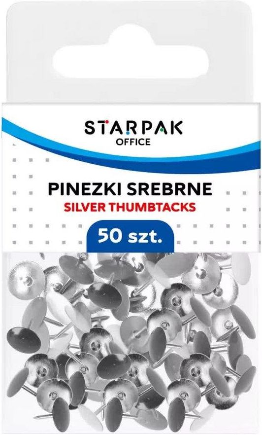 Pinezki do tablic z kolekcji STARPAK dedykowanej dla szkoły i biura. Pinezki w srebrnym kolorze. W zestawie znajduje się 50 sztuk. Idealne do porządkowania tablicy. Nadają się do tablic korkowych lub drewnianych. Pakowane w etui po 50 sztuk. Zapoznaj się również z innymi produktami Starpak! Produkt nieodpowiedni dla dzieci poniżej 3 roku życia. Wymiary/waga produktu: Wymiary opakowania (wys. x szer. x gł.) [cm]: 11x6x2, waga produktu w opakowaniu (kg.) 0,02kg. Pakowanie iner 12 szt. Karton zbiorczy 144 szt. Starpak to ponad 250 produktów biurowych, dzięki którym można kompleksowo wyposażyć miejsce pracy (czy to w firmie czy w domu). Starpak zapewni produkty do organizacji i segregacji dokumentów, długopisy, korektory, zakreślacze, zszywacze, dziurkacze i rozszywacze, przyborniki i kosze na śmieci, i drobne akcesoria biurowe. Ze Starpakiem stworzysz prawdziwe biuro. Pinezki do tablic w atrakcyjnych kolorach ułatwiających porządkowanie tablicy. Nadają się do tablic korkowych lub drewnianychEAN: 5905523688108