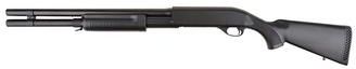 Replika strzelby CM350 Long Rodzinę strzelb Cymy charakteryzują dokładnie te same cechy, co inne produkty tej znanej marki. To przede wszystkim solidna jakość wykonania i dobre osiągi w połączeniu z atrakcyjną ceną. CM350 to replika strzelby o napędzie spreżynowym, co najważniejsze posiadająca aż 3 lufy wewnętrzne! Pozwala to na wystrzelenie 3 kulek jednocześnie za jednym pociągnięciem spustu, a dzięki temu uzyskanie zdecydowane przewagi na polu walki. Szczególnie podczas airsoftowych potyczek o charakterze CQB (choć nie tylko!). 6mm amunicję ładuje się do dołączonej atrapy shellsa o pojemności 30 kulek, którego następnie umieszczamy w komorze nabojowej, co nadaje użytkowaniu repliki dodatkowego powiewu realizmu. Poszczególne elementy repliki zostały bardzo dobrze spasowane. Ze ZnAlu wykonano tu lufę zewnętrzną oraz prowadnicę chwytu, klapkę komory nabojowej, zaczepy pasa nośnego, i blaszkę wyrzutnika łusek. Do produkcji pozostałych elementów, takich jak chwyt z kolbą, korpus, czy chwyt przeładowania, użyto mocnego tworzywa polimerowego. Chwyt przeładowania dzięki antypoślizgowej fakturze obsługuje się wygodnie, a jego praca jest płynna po chwili treningu można prowadzić ze strzelby szybki i skuteczny ogień. Kulka wystrzelona z każdej z 3 luf jest lekko podkręcona, co podnosi skuteczność ostrzału. Przełącznik bezpiecznika oraz przycisk blokady klapki komory nabojowej znajdują się zaraz obok języka spustowego, przez co ich obsługa jest szybka i intuicyjna. Model CM350 posiada wygodną, stałą kolbę, zakończoną grubą stopką z gumy. Do repliki pasują również 30kulkowe shellsy innych producentów, m.in. GFC Guns i Double Eagle. W zestawie znajduje się: replika 1 x shells szybkoładowarka do kulek wycior