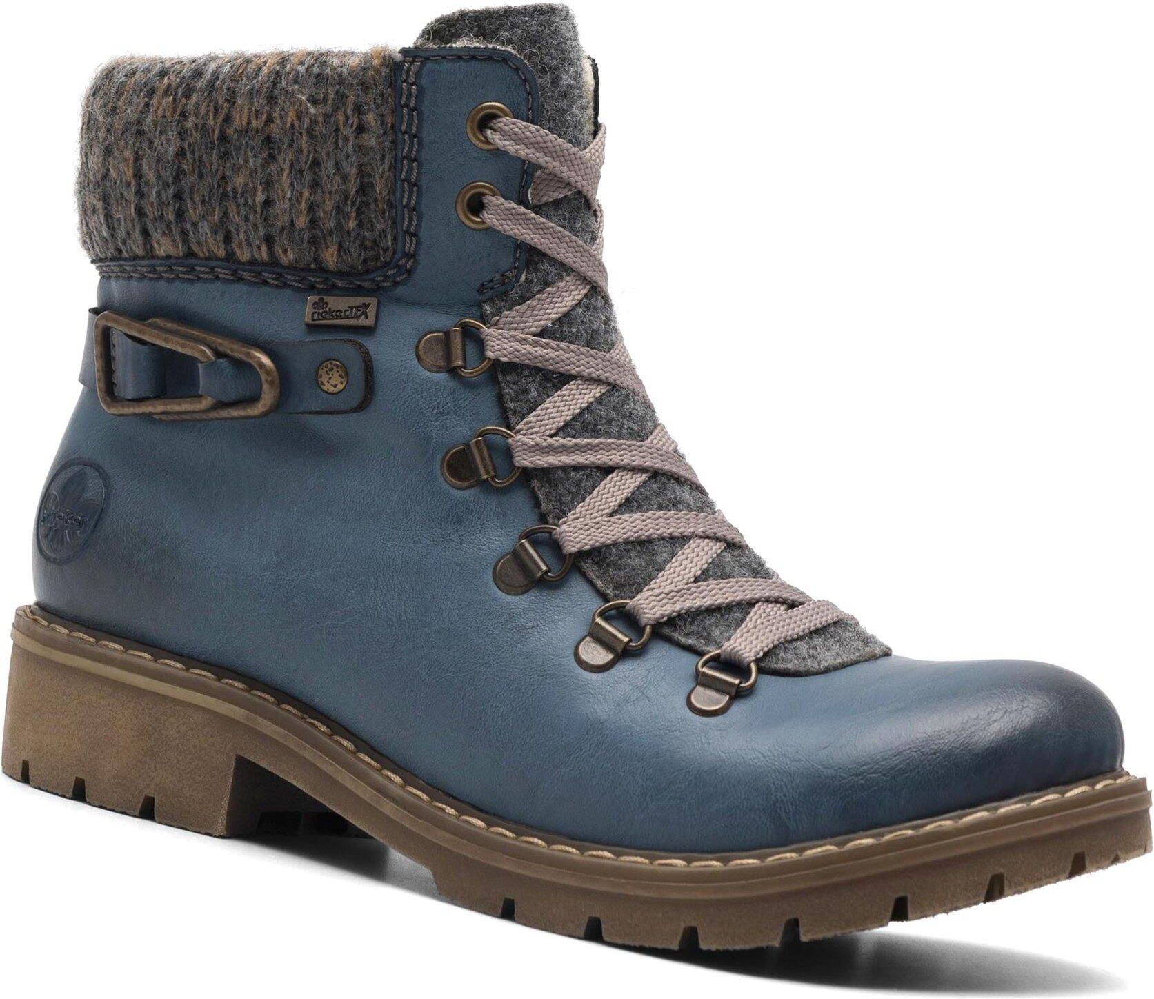 Trzewiki damskie marki Rieker w pięknym, niebieskim kolorze to must-have dla każdej kobiety, ceniącej styl i wygodę! Wykonane z wysokogatunkowego tworzywa syntetycznego, zapewniają wyjątkową trwałość i komfort noszenia. Dzięki zastosowanej technologii Rieker Tex, buty są wodoodporne, co czyni je idealnym wyborem na każde warunki pogodowe. Trzewiki Rieker to połączenie nowoczesnego designu i praktycznej funkcjonalności – idealne na co dzień i na specjalne okazje. Postaw na jakość i modny styl z marką Rieker! Od ponad stu lat marka Rieker oferuje niezwykle komfortowe i trwałe obuwie, które powstaje z myślą o zdrowiu stóp. Dzięki wieloletniemu doświadczeniu w produkcji obuwia, ta niemiecka marka doskonale potrafi łączyć wygodę ze stylem, dlatego w ofercie znajdziesz buty w modnych, oryginalnych fasonach, które każdemu przypadną do gustu. Buty Rieker tworzone są z materiałów wysokiej jakości, przez co odznaczają się wyjątkową elastycznością i trwałością, ale też lekkością. Ponadto w obuwiu stosuje się szerszą formę zapewniającą odpowiednią stabilizację stopy, specjalne podeszwy absorbujące wstrząsy oraz odciążające stawy i kręgosłup, a także wyjmowane wkładki z pianki Memory Foam, która idealnie dopasowuje się do kształtu stóp. To doskonałe produkty dla tych, którzy ponad wszystko cenią sobie komfort. Przekonaj się!