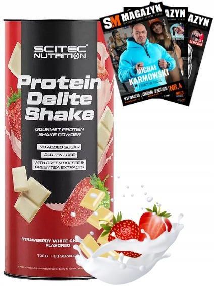 SCITEC Protein Delite Shake 700 g Smak: wanilia - jagoda Zalety SCITEC Protein Delite Shake 700 g Odżywka białkowa najwyższej jakości. Skład wzbogacony liofilizowanymi kawałkami owoców. Pełnowartościowe proteiny. Doskonałe źródło aminokwasów BCAA. Zawiera enzym Aminogen®. Wspiera budowę masy mięśniowej. Długotrwale zaspokaja apetyt. Świetny zamiennik dla niezdrowych słodyczy. Opis SCITEC Protein Delite Shake 700 g SCITEC Protein Delite Shake 700 g to pyszna odżywka białkowa o smaku białej czekolady i truskawki, charakteryzująca się doskonałą rozpuszczalnością i wchłanianiem. Jest idealnym dodatkiem do codziennej diety, dostarczającym proteiny oraz cenne składniki aktywne. Pomaga zaspokoić pragnienie na słodycze, eliminując potrzebę podjadania niezdrowych przekąsek bogatych w puste kalorie. Delite Shake zawiera wysokiej jakości koncentrat białka serwatkowego, wspierający rozwój masy mięśniowej i jednocześnie pomagający w redukcji tkanki tłuszczowej. Produkt jest również bogatym źródłem aminokwasów BCAA, które wspomagają regenerację po treningu i hamują katabolizm. Dodatkowo, zawiera opatentowany enzym Aminogen®, który maksymalizuje wchłanianie i wykorzystanie białek. Odżywka jest wzbogacona liofilizowanymi kawałkami owoców, które zachowują swoje wartości odżywcze dzięki procesowi mrożenia i suszenia. Dzięki temu Delite Shake jest również źródłem witamin i minerałów, a jego smak przypomina pyszny koktajl owocowy. Dla kogo? SCITEC Protein Delite Shake 700 g jest rekomendowana dla osób budujących masę mięśniową, które chcą utrzymać wysoki poziom anabolizmu. Produkt jest również odpowiedni dla tych, którzy poszukują zdrowej i pożywnej przekąski białkowej, uzupełniającej codzienne zapotrzebowanie organizmu na proteiny i zapewniającej długotrwałe uczucie sytości. Składnik: na 30 g Wartość Energetyczna (energia): 494 kJ / 117 kcal Tłuszcz: 2.8 g - w tym kwasy tłuszczowe nasycone: 1.9 g Węglowodany: 3.80 g - w tym cukry: 1.3 g Błonnik: - Białko: 19 g Sól: 0.5 g Witamina E: 6 mg Cynk: 4.9 mg Jod: 28 µg Chrom: 22 µg L-winian L-karnityny: 314 mg - w tym karnityna: 214 mg Ekstrakt z liści zielonej herbaty: 121 mg - w tym polifenole: 60.5 mg - w tym kofeina: 8.5 mg Ekstrakt z ziaren zielonej kawy: 100 mg - w tym kwas chlorogenowy: 47 mg - w tym kofeina: 2 mg Składniki: Koncentrat białka serwatki instant 74% [koncentrat białka serwatki, emulgator: lecytyny (z soi)], koncentrat białka mleka 9,7%, kawałki czekolady 5,1% [masa kakaowa, emulgator: lecytyny (z soi), kakao o obniżonej zawartości tłuszczu, aromat naturalny], kakao w proszku o obniżonej zawartości tłuszczu 3,2%, aromaty, substancja zagęszczająca (guma ksantanowa), L-winian L-karnityny 1%, sól, ekstrakt z liści zielonej herbaty (camellia sinensis) 0,4%, ekstrakt z ziaren zielonej kawy (coffea robusta) 0,3%, substancje słodzące ( acesulfam k, sukraloza), substancja przeciwzbrylająca (dwutlenek krzemu), octan DL-alfa-tokoferylu [octan DL-alfa-tokoferylu, substancja przeciwzbrylająca (dwutlenek krzemu)], siarczan cynku, jodek potasu, pikolinian chromu. Sposób użycia Wymieszać 1 porcję (30 g) Profein Delite Shake w proszku z 300 ml wody dziennie. Przyjmować jedną porcję po treningu w dni treningowe i jedną porcję po przebudzeniu rano w dni odpoczynku. Przeciwwskazania Nie zaleca się stosowania przez osoby uczulone na którykolwiek ze składników produktu. Suplement diety nie może być substytutem (zamiennikiem) zdrowego trybu życia. Nie przekraczać zalecanej dziennej porcji. Przechowywanie Przechowywać w suchym i ciemnym miejscu niedostępnym dla małych dzieci. Podmiot odpowiedzialny: BioTech USA Polska Sp. z o. o., NIP: 8992755408, Zamkowa 21a, 95-200 Pabianice. DO KAŻDEGO ZAMÓWIENIA OTRZYMUJESZ GRATIS! SM MAGAZYN - VIDEOBOOK DLA MIŁOŚNIKÓW SPORTU Wywiady z ikonami sportu Treningi z najlepszymi w swojej dziedzinie Diety Poradniki Ciekawostki Robiąc zakupy otrzymujesz nielimitowany dostęp do darmowego videobooka SM Magazyn, który wysyłamy do Ciebie w formie elektronicznej po opłaceniu zamówienia. Otrzymujesz także dostęp do pełnego archiwum! Jesteśmy autorem oraz wydawcą videobooka SM Magazyn. Dzieło zarejestrowane pod ISBN: 978-83-955667-1-4