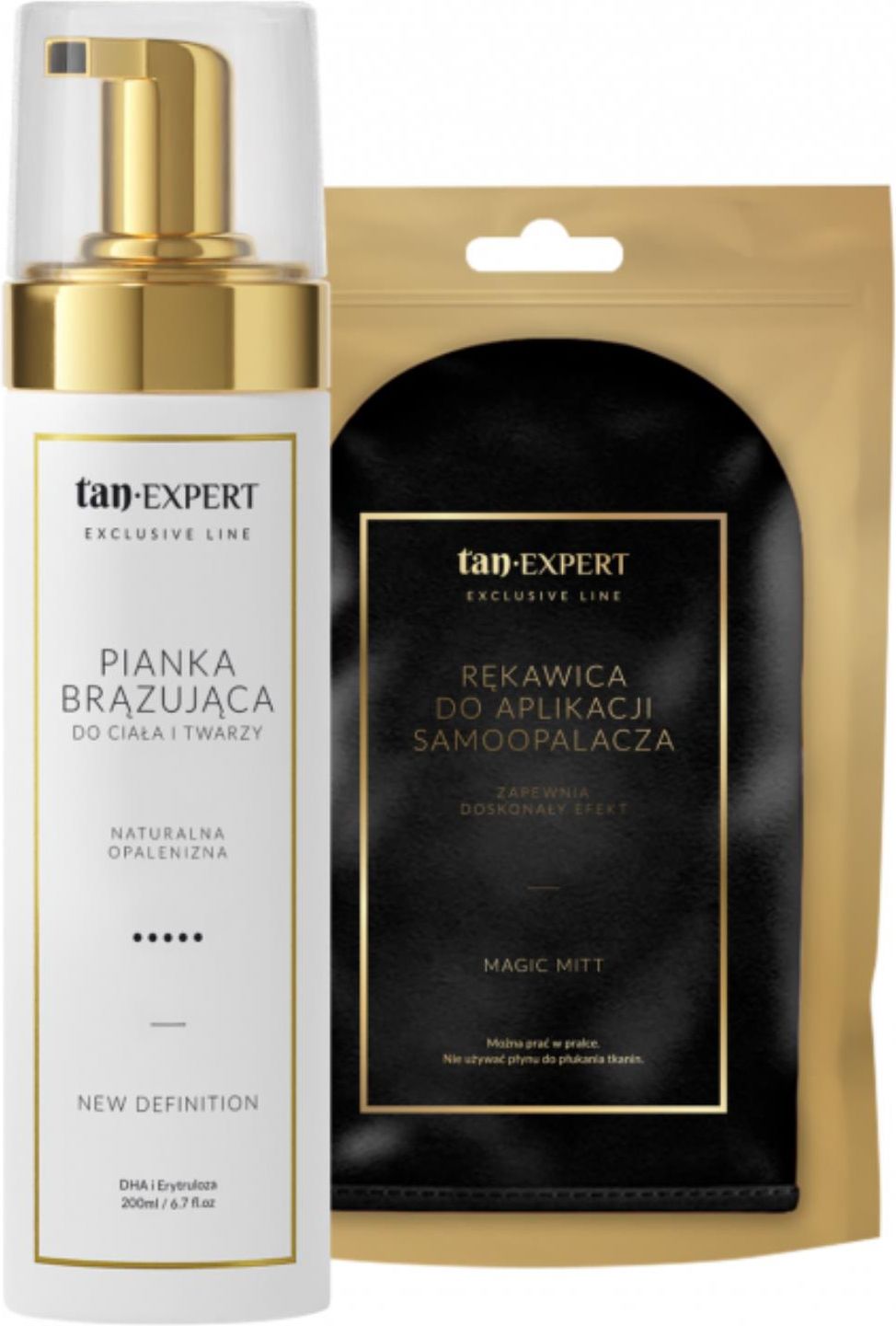 TanExpert New Definition Pianka Samoopalająca + RękawicaTanExpert New Definition Pianka Samoopalająca 200mlPianka New Definition z linii Exclusive otwiera nowy rozdział w świecie kosmetyków do twarzy i ciała. Wykwintna formuła, która wyróżnia całą gamę produktów Exclusive, pozwala na uzyskanie wyjątkowego efektu, dostosowanego do indywidualnych potrzeb.W porównaniu z pianką The One, New Definition oferuje delikatniejszy bronzer wstępny, dostarczając bardziej subtelne efekty. Ponadto, zastosowano unowocześnioną technologię anti-stickiness, która eliminuje uczucie lepkości zaraz po aplikacji samoopalacza. Ta innowacja składa się na nową strukturę pianki, która choć wymaga minimalnie dłuższego czasu do wyschnięcia, gwarantuje łatwiejszą i delikatniejszą aplikację.W stosunku do linii Premium, ekskluzywna formuła New Definition przenosi nawilżenie na wyższy poziom. Szybsze wchłanianie się produktu w skórę oraz brak lepkości już od pierwszych chwil użycia, to jedynie niektóre z korzyści, jakie przynosi ta wyrafinowana propozycja. DHA jest teraz jeszcze mniej odczuwalne, a podczas aplikacji uwodzi przyjemny, perfumowany zapach. Rezultat? Opalenizna nie tylko piękniejsza, ale także trwalsza i mocniejsza, zachowując przy tym subtelność i elegancję wykończenia.Co więcej, New Definition daje możliwość regulacji intensywności opalenizny poprzez dostosowanie czasu działania wstępnego bronzera. Zastosowana technologia zaawansowanych bronzerów, DHA i erytrulozy, zapewnia auto-adaptacyjne właściwości, gwarantując optymalne dopasowanie efektu finalnego do każdej karnacji. New Definition to symfonia piękna i technologii, skomponowana dla najbardziej wymagających.Sposób użyciaDzień przed aplikacją zalecamy wykonać peeling całego ciała. Dzięki temu efekt utrzyma się dłużej.Piankę nakładamy na ciało pozbawione kosmetyków. Aplikujemy ją na rękawicę i rozkładamy kolistymi ruchami.Dłonie i stopy opalamy na samym końcu resztką pianki z rękawicy (mają być jaśniejsze niż reszta ciała - te części ciała mocniej przyjmują bronzer).Odczekujemy kilka minut i nakładamy najlepiej ciemne i luźne ubrania.Piankę trzymamy na ciele od 1 do 3h. Dla wzmocnienia koloru możemy wydłużyć ten czas do 8h.Po tym czasie bierzemy krótki prysznic (45 sekund) samą wodą.Do pełnych kąpieli możemy wrócić po 8h, a finalny efekt będzie widoczny po 24h.TanExpert Exclusive Line Magic Mitt Rękawica Do Aplikacji SamoopalaczaDoskonała w każdym calu, rękawica Magic Mitt nie tylko ułatwi aplikację Twojego ulubionego samoopalacza, ale także pozwoli osiągnąć nieporównywalny efekt głębokiej, jednolitej opalenizny, wolnej od jakichkolwiek smug.Wytworzony z niezwykle miękkiego, dwustronnego materiału, ten innowacyjny produkt nie tylko perfekcyjnie rozprowadza kosmetyk, ale też skutecznie chroni Twoje dłonie przed niechcianymi plamami. Jest to idealne połączenie funkcjonalności i elegancji, dedykowane dla pianek i balsamów samoopalających. A pielęgnacja rękawicy? Prostsza niż kiedykolwiek! Już po pierwszym użyciu przekonasz się, że Magic Mitt to niezastąpione narzędzie w Twojej rutynie pielęgnacyjnej, do którego niejednokrotnie będziesz wracać.Sposób użyciaWłóż rękawicę do aplikacji samoopalacza Magic Mitt i wyciśnij na nią małą ilość pianki samoopalającej.Nałóż piankę na ciało okrężnymi ruchami.Wygładź kolor, aby uzyskać pożądany efekt.Powtórz proces, aby uzyskać ciemniejszą opaleniznę.Rękawica może być używana na obu dłoniach. Przed ponownym użyciem należy ją wypłukać i wysuszyć.