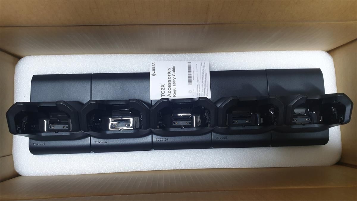 5-portowa ładowarka Zebra CRD-TC2X-SE5CO-01 do jednoczesnego ładowania 5 terminali Zebra TC20 lub TC25. W zestawie jest zasilacz, kabel połączeniowy i kabel zasilający. Sprzęt nowy, oryginalnie zapakowany w kartonie. Gwarancja 12 miesięcy.